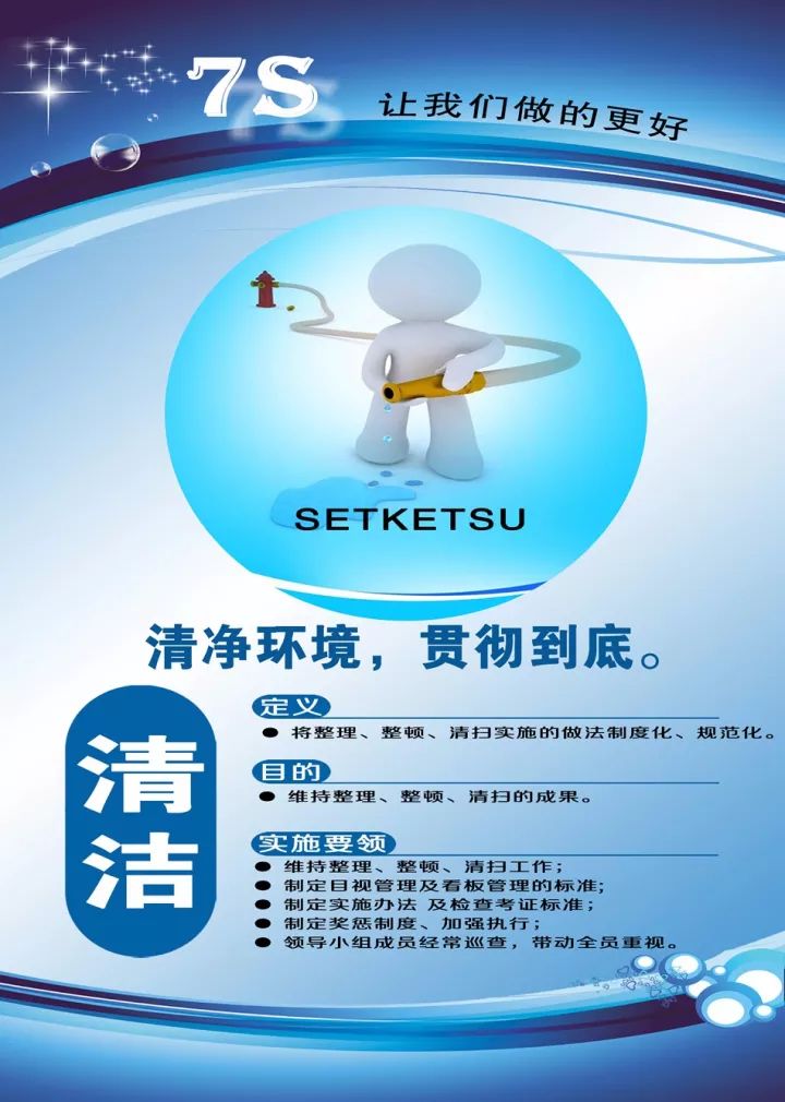 将工作场所内所有的地方,工作时使用的仪器、设备等打扫干净,让工作场所保持一个干净、宽敞、明亮的环境。其目的是维护生产安全、减少工业灾害,保证品质。方法如: