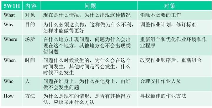 通过对需要解决的对象、目的、地点、时间、人员和方法提出一系列得问题,并寻求解决问题得答案,调查作业效率,提高推行7S管理的效率。