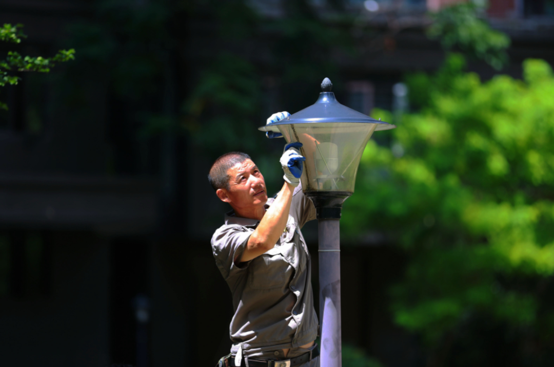 当头烈日下,物业人正在修复小区的路灯,为夜晚归来的业主照亮回家的路。