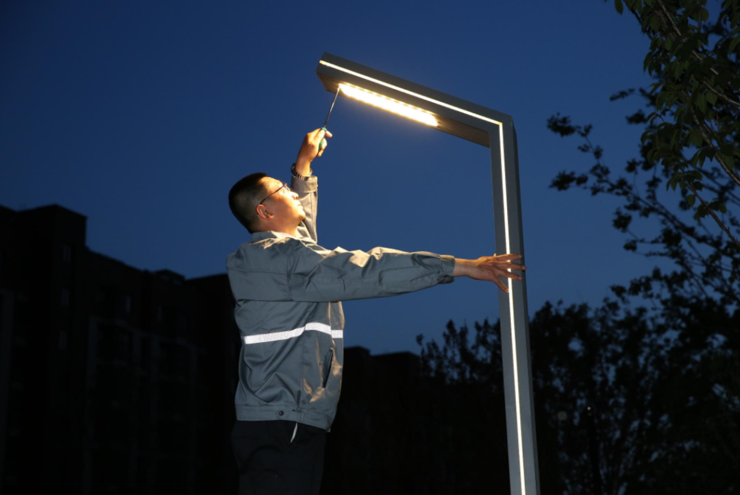 维修员和他的工具包总是形影不离,时而登高作业,时而钻入狭小空间,在无人知晓处守护着社区的正常运行。图为维修员在修复小区路灯。