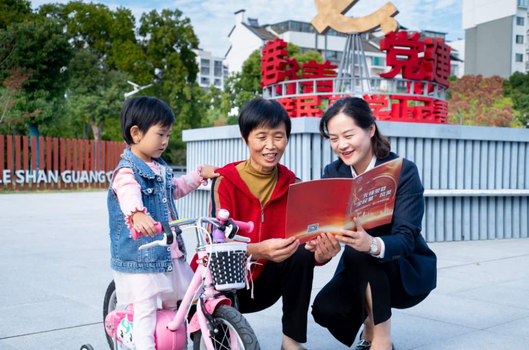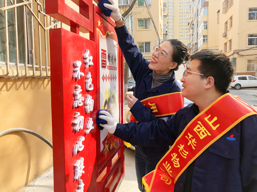 华杉物业坚持党建引领,建设红色物业。图为华杉物业青年员工在所辖项目开展志愿服务,擦拭项目党建宣传栏。
