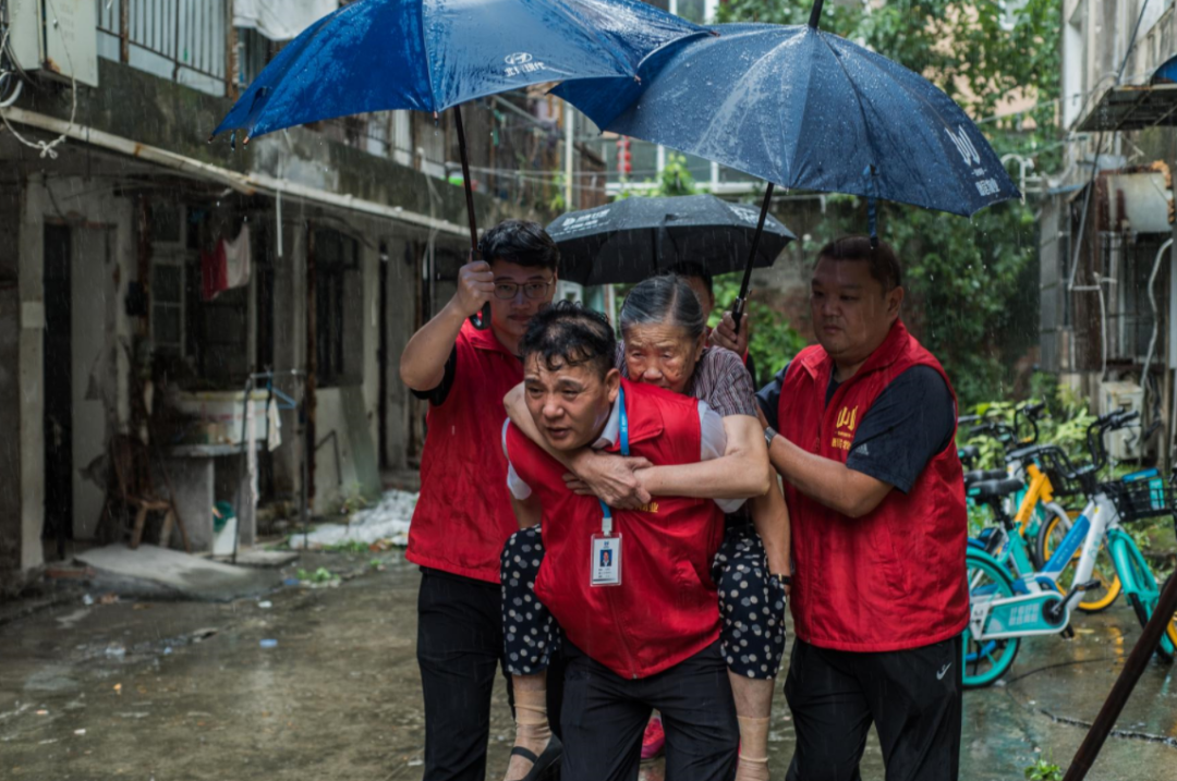 暴雨来袭,为了护送腿脚不便的老人安全转移,康居物业服务人员遮雨挡风一路背负,留下了一路温情。
