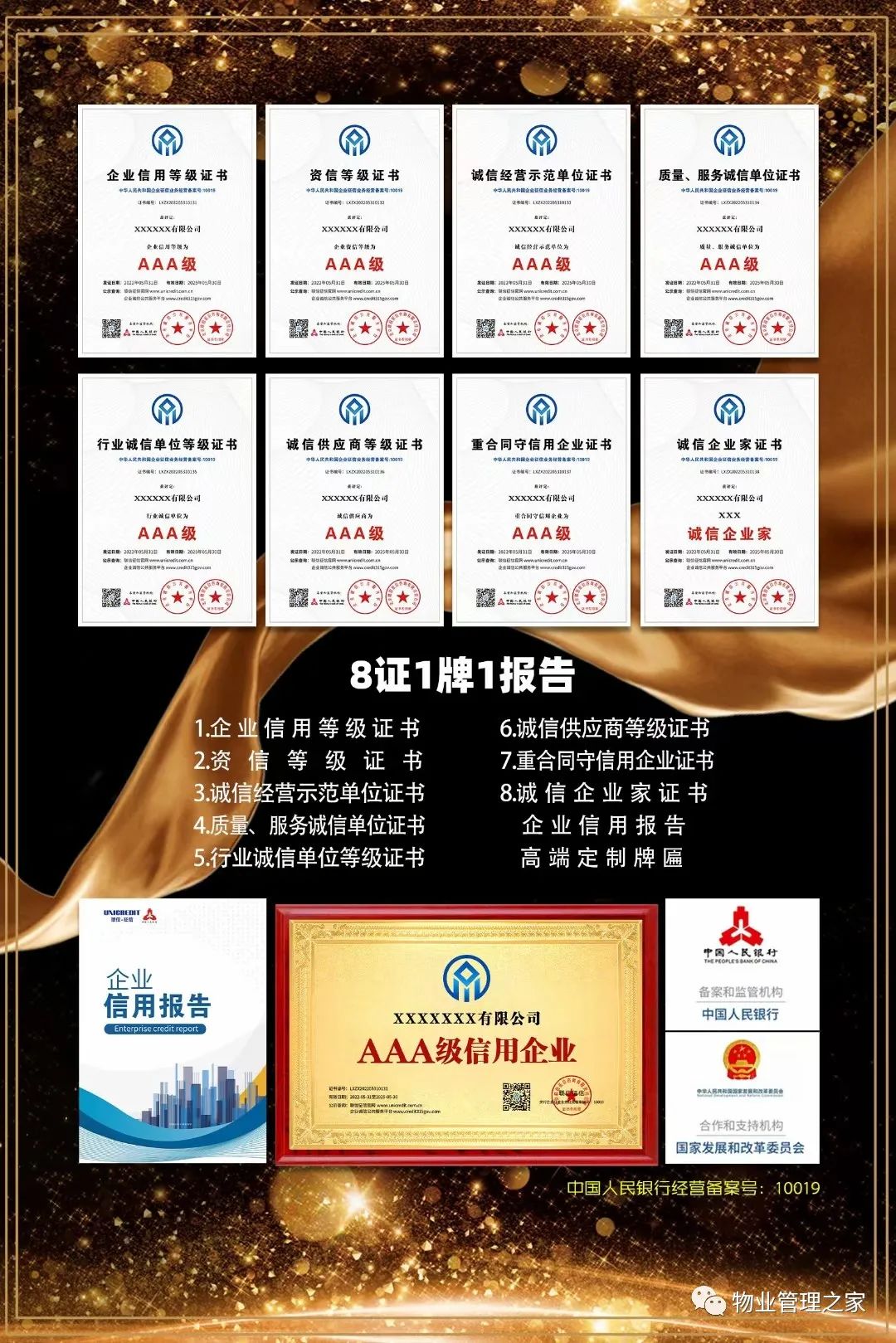 企业AAA信用证书、信用报告是各类企业,特别是后资质时代物业服务企业提升竞争力、扩大知名度、展示形象、参与市场竞争、拓展经营项目、提高市场占有率之必备,更是企业参与项目招投标的预审条件之一。