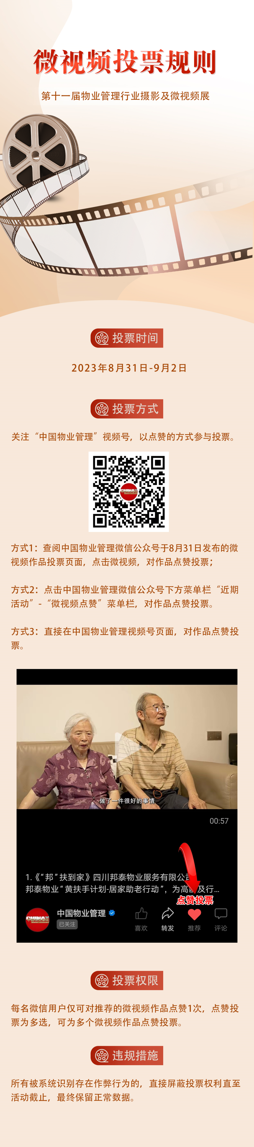 在中国物业管理协会的指导下,《中国物业管理》杂志社联合62家地方协会组织开展的“最美物业人”第十一届物业管理行业摄影及微视频展得到了业界同仁的广泛关注和积极参与,共收集到摄影作品4679幅、微视频作品663个。经评选,特别推荐30个微视频作品,通过微信平台进行点赞投票,届时,优秀作品将亮相10月12-14日在深圳举办的2023中国国际物业管理产业博览会,欢迎大家积极参与,选出你心中的“最美物业人”。点击参与点赞投票