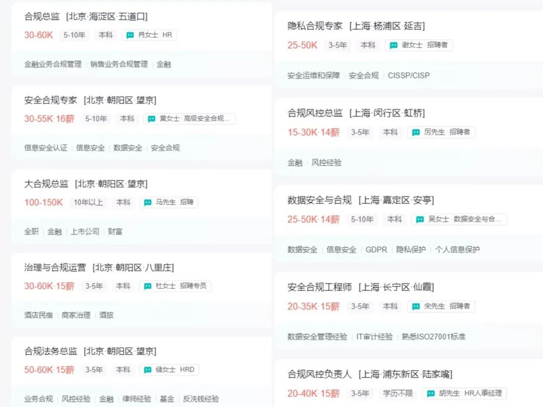 而具备相关从业经验者月薪可达到30-60K,还有15薪的优厚待遇,也有公司开出年薪百万寻求高级合规管理人员!可以说市场相当紧俏了。