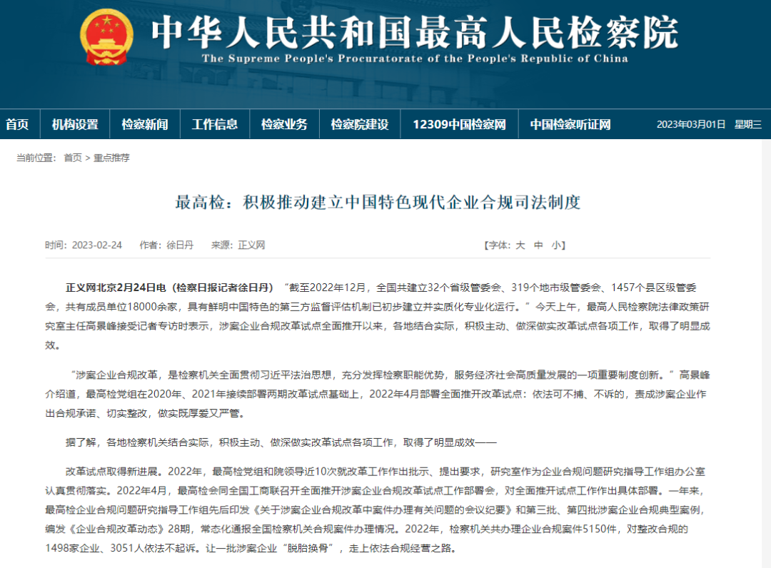 2023年2月24日,最高检:积极推动建立中国特色现代企业合规司法制度。涉案企业合规改革试点全面推开,检察机关办理涉案企业合规案件快速增长。