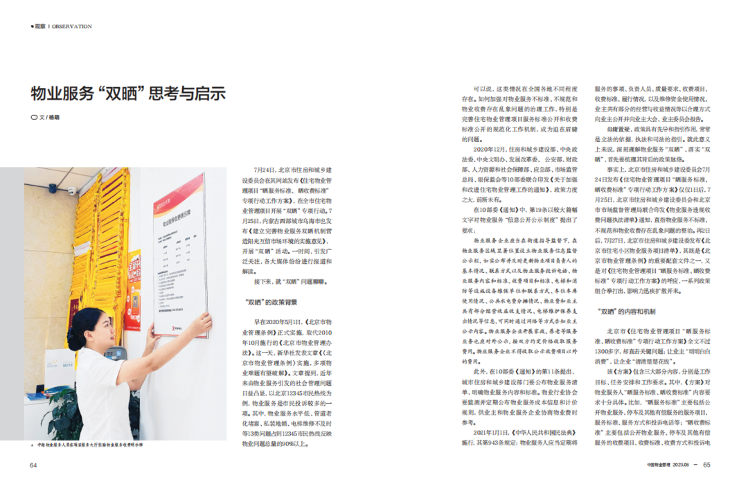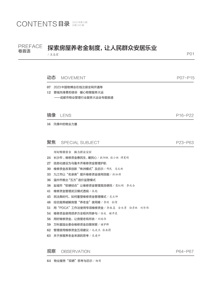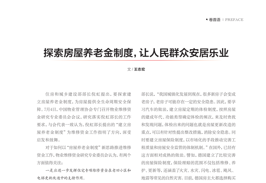 本期卷首语,中国物业管理协会会长王志宏就如何探索“房屋养老金制度”,提出了三点希望。