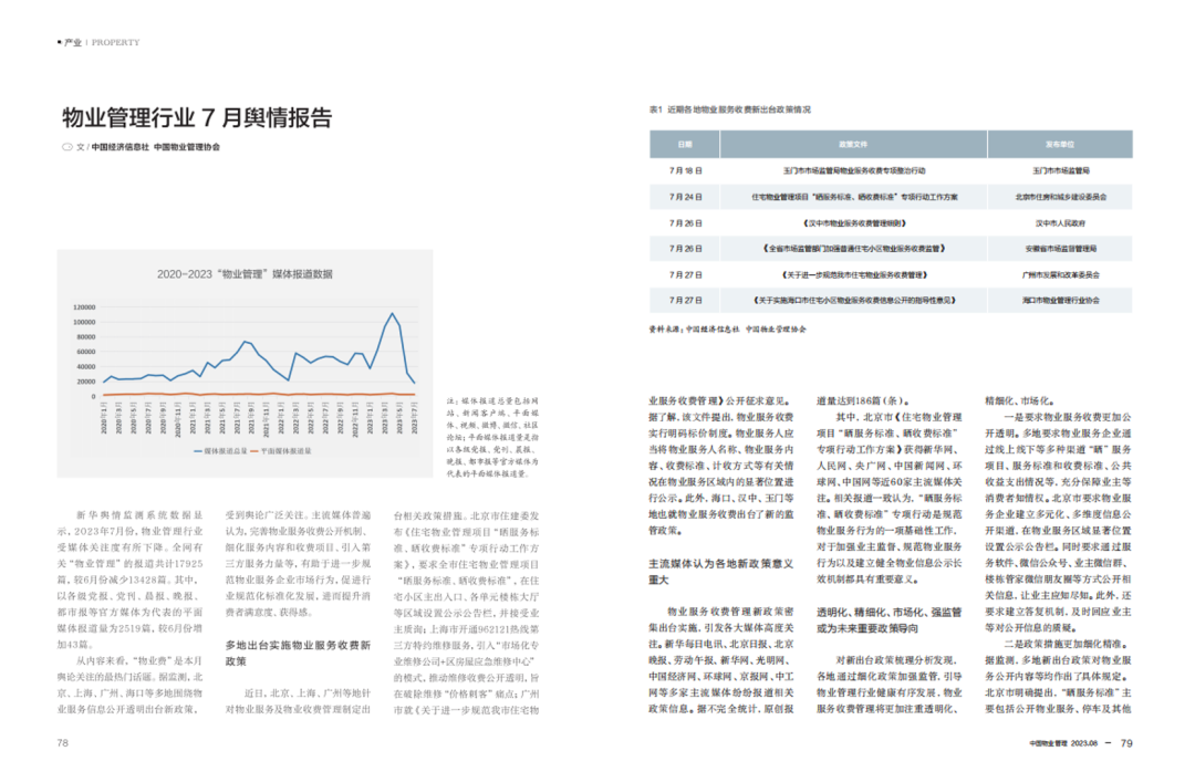 从内容来看,“物业费”是7月舆论关注的最热门话题。主流媒体普遍认为,完善物业服务收费公开机制、细化服务内容和收费项目、引入第三方服务力量等,有助于进一步规范物业服务企业市场行为,促进行业规范化标准化发展,进而提升消费者满意度、获得感。