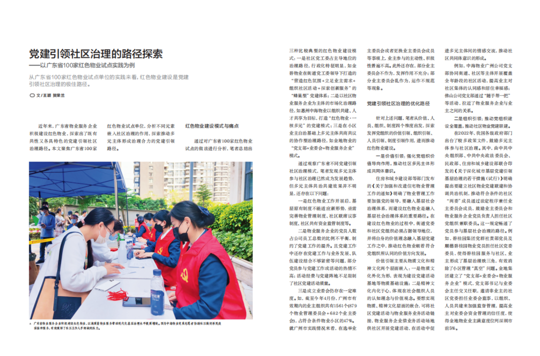 从广东省100家红色物业试点单位实践工作来看,红色物业是党建引领社区治理的极佳路径。在大物业时代,物业管理行业需要聚焦时代发展趋势,凝练各地经验,进一步打造具有中国特色的红色物业品牌,推动物业服务融入基层治理。