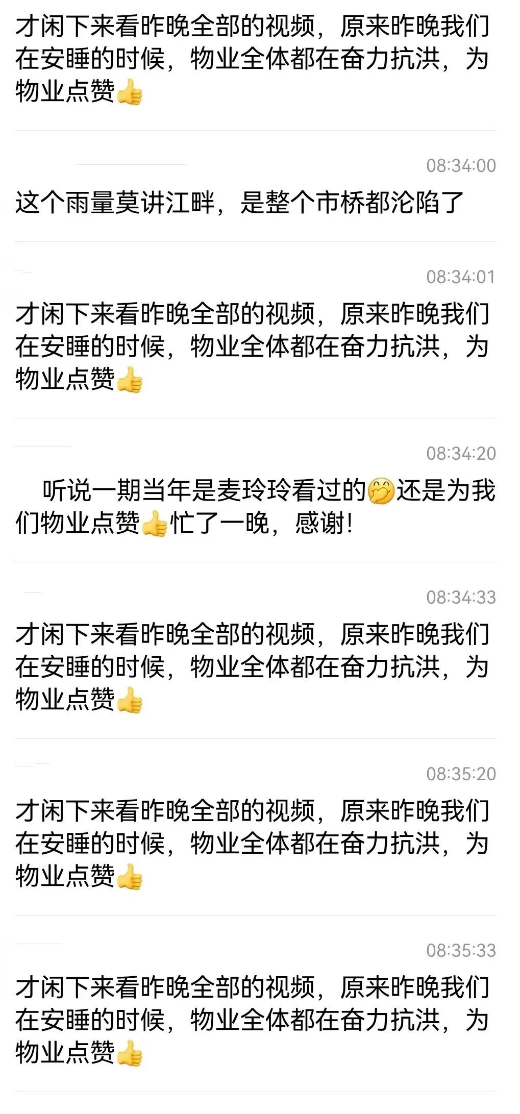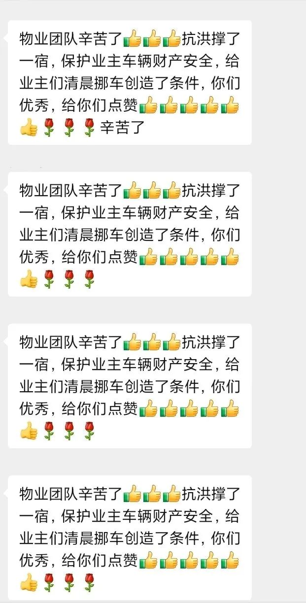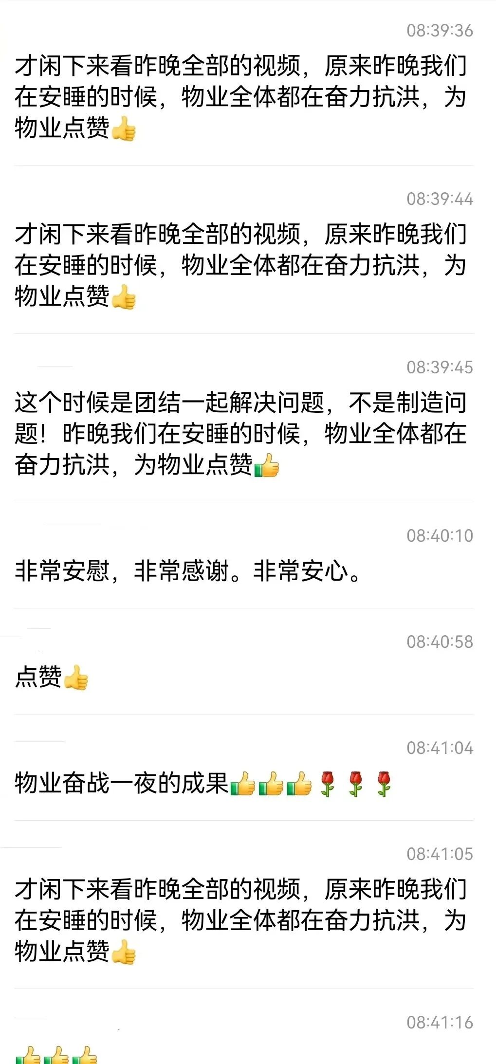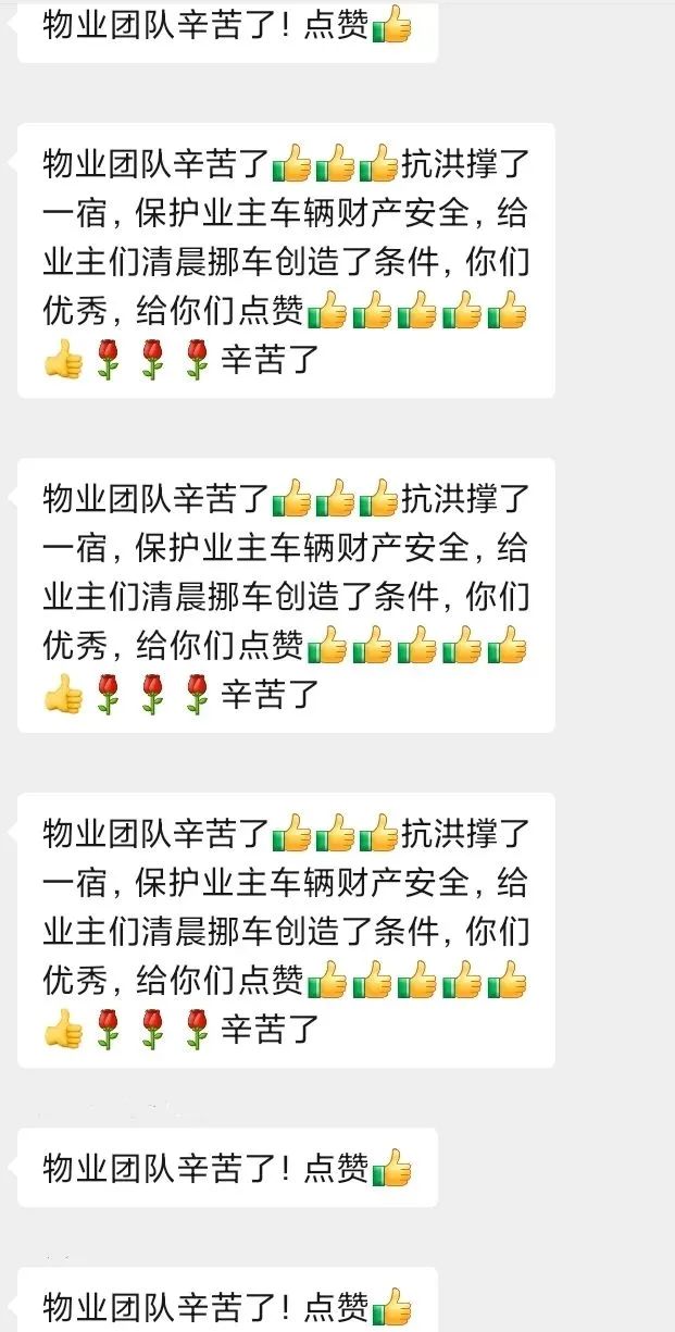 直至9月8日8:30,可逸江畔服务中心员工已通宵奋战了15+小时。此时,业主群里传来持续不断的消息。原来,有不少业主得知昨夜物业工作人员的连夜“奋战”,纷纷在群内点赞,对服务中心全体员工的坚守付出表示衷心的感谢与肯定。在这秋凉的早晨里,一句句亲切的话语如同一股股暖流,流淌进可逸江畔物服团队的心里……