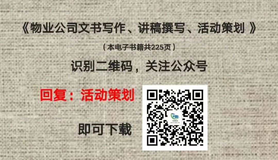 👇点击阅读原文,百部免费资料👇 中秋国庆佳节,物业温馨提示 您好! 物业中秋活动方案一 中 秋 佳 节 一、目标: 物业中秋活动方案二 中 秋 佳 节 一、活动主题 七、活动方案及人员安排 a、控制每个节目演出时间,按预定计划执行,避免因节目噪音引发的业主投诉。 b、活动结束后保洁员现场卫生的清理。 a、音响设备电源电线由物业部负责安全检查维护; b、现场由物业公司保安员维护秩序,防止人群拥挤,发生意外。 首先由主持人向晚会参与人员介绍垃圾分类知识。 物业中秋活动方案三 中 秋 佳 节 一、家庭摄影比赛 以xx广场为主,向景观带各组成部分延伸。 (1)主舞台设置在xx广场; (2)为保护绿地,建议用绿色地毯覆盖绿地; (3)活动现场周围放置月饼,茶水等饮料食品供参加活动的业主们食用。 xx新城业主均有资格参加(重点突出包括认购丁香苑的客户),但考虑到活动现场的容量,建议在媒体上发布活动信息,注明某时间开始,前100位报名的客户可获得现场参与活动的机会,将会收到xx新城发出的邀请函,每张邀请函限三人参加。其余客户可获赠xx新城提供的月饼礼盒一份。 由xx新城员工与客户上台表演节目(唱歌、舞蹈等),考虑聘请现场乐队。 (1)心有灵犀,父母与孩子分做一长桌两端,中间隔一木板,使其相互看不到,父母面前放置三种食品,由孩子吃其中一种食品,然后表演吃这种食品的表情给父母看,由父母来猜孩子吃的是哪一种食品。 (2)踩气球等一些简单易执行且能很好的渲染现场气氛的活动。 现场互动游戏应为所有上台参与者都发送奖品,且优胜者和没有获胜者的奖品差异不大。 (1)邀请函; (2)活动手册; (3)舞台背景喷绘; (4)绿地毯; (5)月饼等食品; (6)舞台搭建; (7)领导坐席; (8)各种游戏道具。 2、冷餐会标准为50元/人。 物业中秋活动方案四 中 秋 佳 节 一、活动背景 2、简单介绍关于中秋的来历、意义等相关信息,可以让业主们说出以前或者最难忘的一次过中秋的情形,与大家一起分享幸福和乐趣。 往期精彩回顾 ▶ 物业呼吁:楼上楼下邻居,请文明使用下水管道! ▶ 电梯有盲区!16个惨痛教训!请转业主群 ▶ 我是物业公司,下列问题找物业··· ▶ 自己买的车位,为什么还要交车位管理费? ▶ 一次说清!你交的物业费包括啥?不包括啥? ▶ 业主经常问的14个问题,《民法典》里有答案 ▶ 致业主:房子虽然是您的但是这10个地方绝对不能动! 1、免费下载 | 全套物业管理制度表格 2、免费下载 | 物业管理服务品质提升方案【8个PPT】 3、免费下载 | 向标杆物业学习!万科物业服务品质管理体系文件 4、免费下载 | 收藏!民法典与物业管理大全 5、免费下载 | 学习是最好的投资!从零开始学做物业经理【282页】 6、免费下载 | 值得学习!小区物业客服部运行守则【249页】 7、免费下载 | 实用!物业管理工作图表设计范例【287页】 8、免费下载 | 【超级全面】物业管理案头必备手册!含各部门职责、流程、表格 9、免费下载 | 学习!物业环境管理工作手册【112页】 10、免费下载 | 物业企业必备的51个制度和流程【280页】 11、免费下载 | 干货收藏!万科物业职能类管理表格【93个】 12、免费下载 | 干货!物业保洁管理读这本书就够了!【333页】 13、免费下载 | 物业标准化管理图示307页 14、免费下载 | 物业公司客服中心工作手册 15、免费下载 | 物业工程管理作业手册【185页】 16、免费下载 | 干货!项目前期物业管理投标文件【179页】 17、免费下载 | 物业安全管理!治安、交通、车辆、消防、应急管理与培训手册 18、免费下载 | 学习!物业保安主管365天管理笔记【含计划、总结、表格】 19、免费下载 | 干货!政府机关物业服务方案【102页】 20、免费下载 | 收藏!物业常用表格大全~拿来就用【142项】 21、免费下载 | 物业管理前期介入与承接查验十堂课【162页】 22、免费下载 | 超全:物业管理工程维修工作手册【97页】 23、免费下载 | 【干货PPT】物业客服部礼仪礼节培训! 24、免费下载 | 向标杆物业学习!万科物业管理实操案例 【37篇】 25、免费下载 | 完整版物业装修管理培训手册【收藏】 26、免费下载 | 万科物业品质管理、设备设施及安全督导标准【111页】 27、免费下载 | 物业管理员工培训课件110页!学习、培训好助手 28、免费下载 | 【干货PPT】融创物业秩序服务可视化标准93页 29、免费下载 | 【实用】物业管理服务费用成本测算模板 30、免费下载 | 【干货PPT】绿化养护培训大全113页—学习、借鉴! 微信 |电话:199 0636 8688 王老师 微信 |电话:188 0636 7288 李老师 全国客户服务热线:400 8899 681 扫描二维码加我微信 点击 “阅读原文” 百部免费物业资料