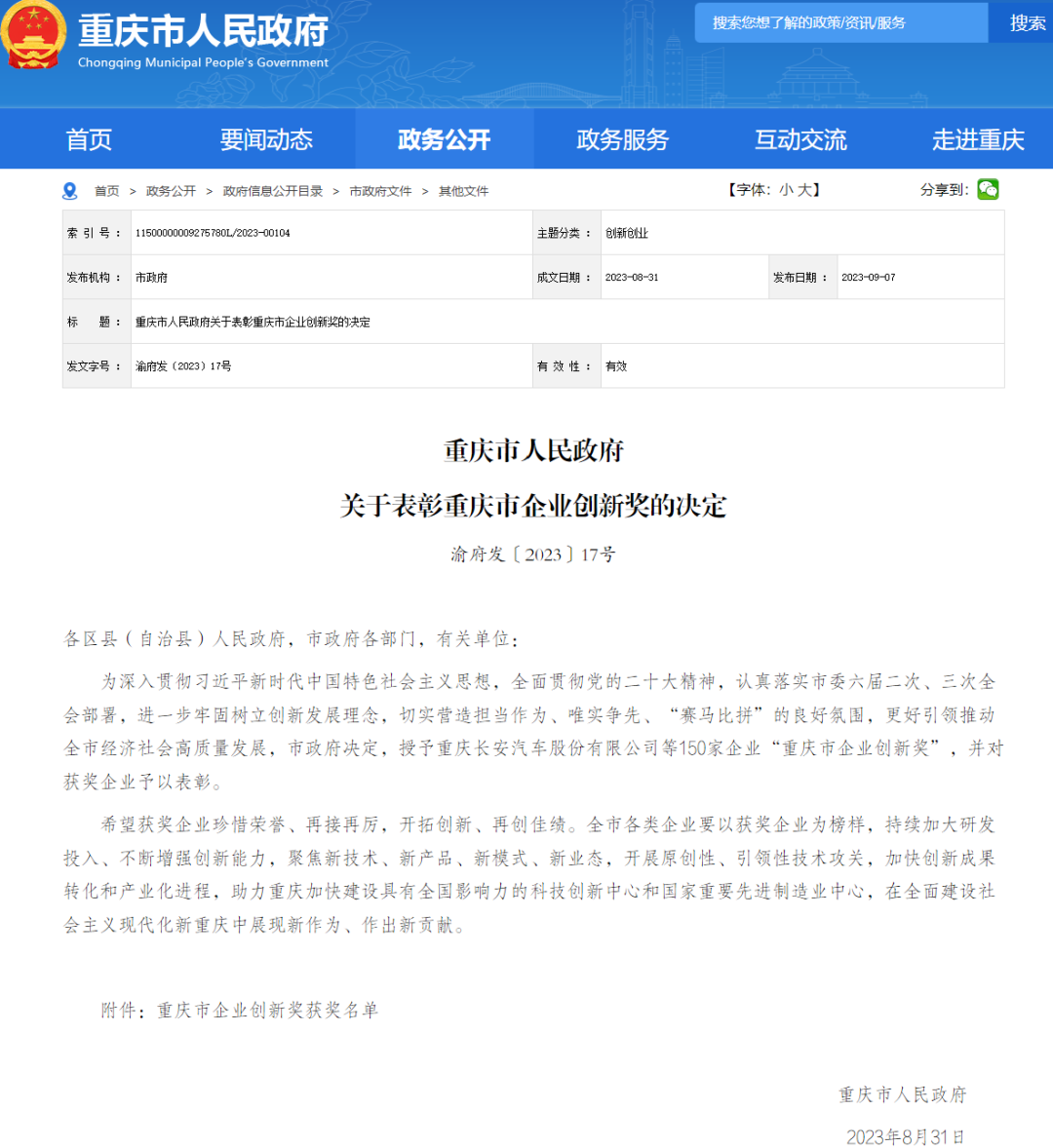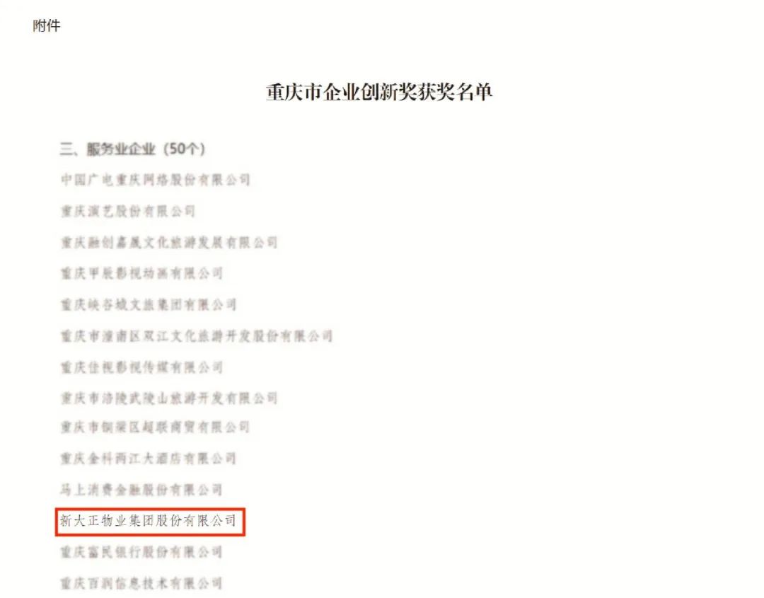 持续创新可以助推企业稳定、健康、可持续发展。那么,企业创新的机会点在哪里?什么样的创新能够保证企业未来的生长力?如何为企业创新提供永动力? 这是企业经营需要长期研究的课题,也是引领推动经济社会高质量发展的重要一环。新大正交出了自己的答卷。 日前,重庆市人民政府正式宣布《关于表彰重庆市企业创新奖的决定》,新大正凭借多年来在服务领域的创新研究和突出成果,荣获“重庆市企业创新奖”。 重庆市人民政府发布表彰决定(仅展示部分获奖名单) “重庆市企业创新奖”是为深入贯彻创新发展理念,突出企业创新主体地位,经党中央、国务院批准,市政府评选表彰一批为重庆市经济社会创新发展作出突出贡献的先进典型而设立的奖项,旨在营造担当作为、唯实争先、“赛马比拼”的良好氛围,鼓励全市各类企业要以获奖企业为榜样,持续加大研发投入、不断增强创新能力,在全面建设社会主义现代化新重庆中展现新作为、作出新贡献。 1998年成立以来,新大正就致力于企业创新,通过对行业市场及自身优势的研判,确立了差异化的市场战略定位,在模式创新、服务创新、产品创新等方面成绩斐然。截至目前,新大正管理的物业服务中心800多个,服务面积约1.42亿平方米。 新大正深耕公建物业20余年,秉持差异化战略定位,持续专注于中国未来智慧城市公共建筑与设施的管理和运营,在公建物业领域保持相对竞争优势。 根据“五五”战略规划,新大正在以基础物业为业务开展“基本盘”的同时,不断探索和自我突破,形成以基础物业服务为支撑,快速发展城市服务、孵化发展创新服务的三大业务板块协同发展局面,探索服务模式创新,保持稳定增长态势。 新大正业务板块 值得关注的是,创新服务作为公司战略高地,是新大正未来的利润核心来源。该业务包括传统、创新类增值服务与数字化产品,涵盖平台运营、增值服务、数据业务、线上经营等细分产品,将以数字化支撑基础服务及城市服务快速发展。在创新服务的落地和能力建设方面,新大正着力客户多样性需求满足,开发资源、夯实体系,嫁接内外部资源,形成体系化、专业化创新服务产品,截止今年上半年,创新服务营收同比增加9.26%。 此外,新大正也积极落地轻资产运营的城市服务商业模式,着力打造市政环卫专业化领域子品牌。目前已完成对和翔环保、香市和翔及瑞丽缤南的收购,进一步丰富了公司在环卫板块的作业业绩、专业领域经营能力,提升了市场综合竞争力。同时,新大正中标重庆市璧山一体化项目,未来将以璧山项目为试点,形成以“长效运营”为切入点的城市运营业务发展模式。 重庆市璧山区老旧小区改造项目 优质的服务以客户为基点进行设计,多年来,新大正始终关注客户体验和需求满足,致力于以标准化提升专业服务水准,并推动行业进步。2008年,新大正便成立了“企业标准化研究院”,建立了系统、先进、科学的企业标准体系。经过多年实践总结,形成了以服务标准化为核心,贯穿服务产品研究、项目服务实现的全链路标准开发模式。 作为中国物业管理协会标准化工作委员会秘书处承担单位、全国服务业标准化试点单位,新大正先后在重庆市地方标准、物业行业团体标准、国家标准等众多层级起草发布相关标准,先后起草发布了《商务楼宇物业管理服务规范》《高校物业管理服务规范》等多项地方标准,以及编制了《机场航站楼物业服务规范》团体标准,在推动行业规范发展的道路上,持续发挥着专业的力量。此外,由新大正承担的中国物业管理协会2022年年度课题《物业服务企业标准化有效性研究》也成为中物协当年五个优秀课题之一。 新大正承担课题获评“优秀” 今年,国家市场监督管理总局、国家标准化管理委员会批准发布了国家标准GB/T 42185-2022《优质服务原则与模型》,作为该项国家标准的主要起草单位,新大正也是物业行业首家在优质服务领域参与国家标准制定的物业服务企业。 目前,新大正已建立健全企业标准体系,将通过职业健康安全体系、质量管理体系、环境管理体系、信息安全体系、诚信管理体系、食品安全管理体系、能源管理体系、服务体系、企业社会责任管理体系等九大管理体系的有机整合,为项目管理提供高质量服务标准。 在服务创新的驱动下,新大正以标准化为核心战略,不断提升服务品质,改善服务效率,持续推动物业管理行业服务质量提升。 为推进创新快速落地,新大正构建了系统化的创新产品支撑体系,积极打磨创新拳头产品。 截止目前,新大正已形成结合客户生产经营、生活服务需求满足的企业服务产品,结合国家绿色发展的综合能源管理产品,基于城市通行效率提升的智慧停车产品等专业化创新服务产品体系,立项27个重点项目,落地包括某主题场馆车场空间运营业务、某商业写字楼企服中心业务、某机关办公楼能源业务、某园区后厨建设业务等多个重点项目。 同时,新大正上线小新菁选、S潮宝等服务专属的线上平台,并立足综合服务中心平台,为注册会员打造多种业态场景的专属服务产品,提供节能减排、智慧车场、私域资源等平台的智慧运营服务。 2021年,新大正成立慧链云科技,积极搭建支撑项目发展的数字化体系,用科技力量探索新模式,助力公司未来业务的新兴增长。截至目前,慧链云系统已完成数据及技术支撑平台