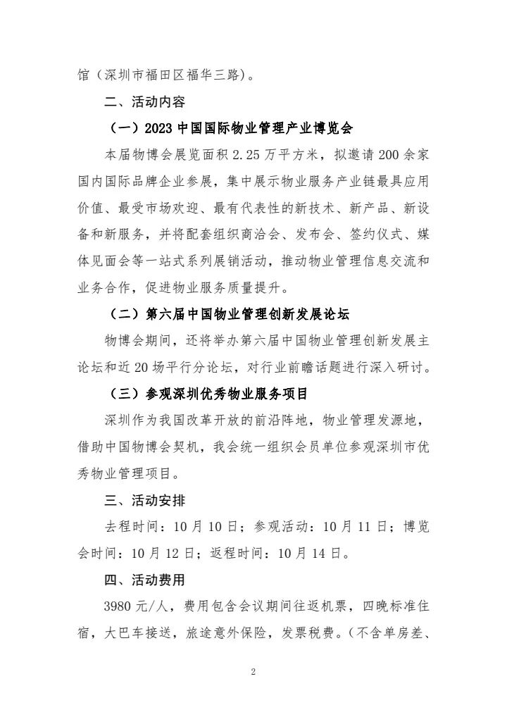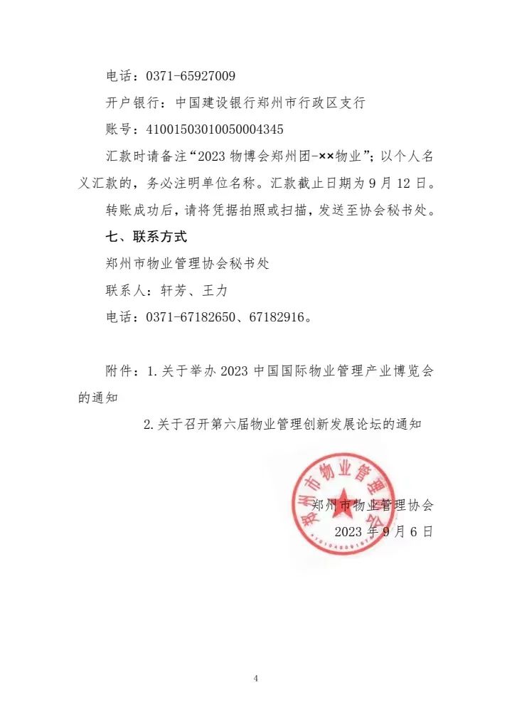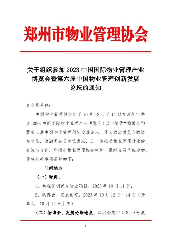 9月6日,郑州市物业管理协会发布《关于组织参加2023中国国际物业管理产业博览会暨第六届物业管理创新发展论坛的通知》,将组织会员单位参加2023中国国际物业管理产业博览会、第六届物业管理创新发展论坛及相关配套交流活动。