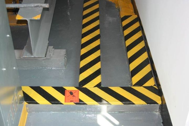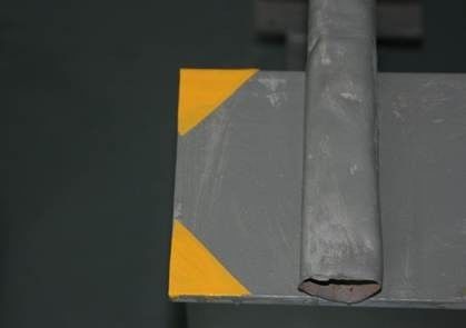 注意:若选择现场油漆涂刷,则建议用黄色做打底色,再将间距测量好用黑色油漆涂刷斜杠,切勿用黑色打底,会造成黄色无法盖住黑漆。