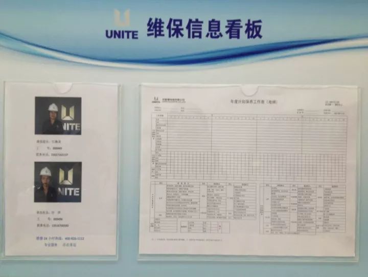 看板需张贴在机房进门醒目位置,建议设置在机房一进门左手边空白墙上,左边为负责电梯2名维保人员的信息,包括姓名,员工号,联系方式,24小时维保热线及标语:专业服务、尽心服务;右边为年度保养工作计划表,A3纸大小,记录每次员工维保情况。