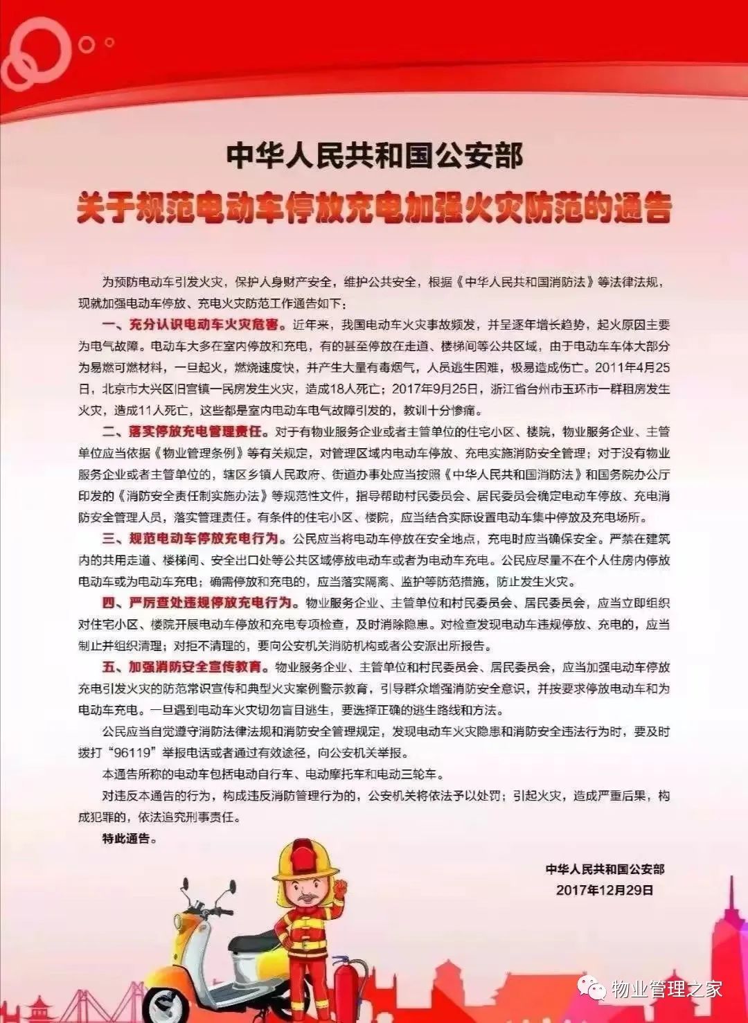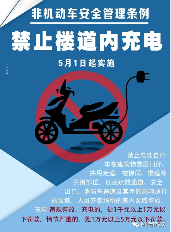 三、国务院办公厅《关于印发消防安全责任制实施办法的通知》第十八条:物业服务企业应当按照合同约定提供消防安全防范服务,对管理区域内的共用消防设施和疏散通道、安全出口、消防车通道进行维护管理,及时劝阻和制止占用、堵塞、封闭疏散通道、安全出口、消防车通道等行为,劝阻和制止无效的,立即向公安机关等主管部门报告。 四、公安部《关于规范电动车停放充电加强火灾防范的通告》:严禁在建筑内的共用走道、楼梯间、安全出口处等公共区域停放电动车或者为电动车充电。
