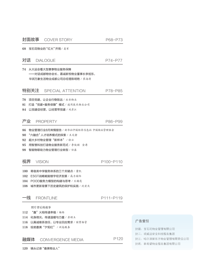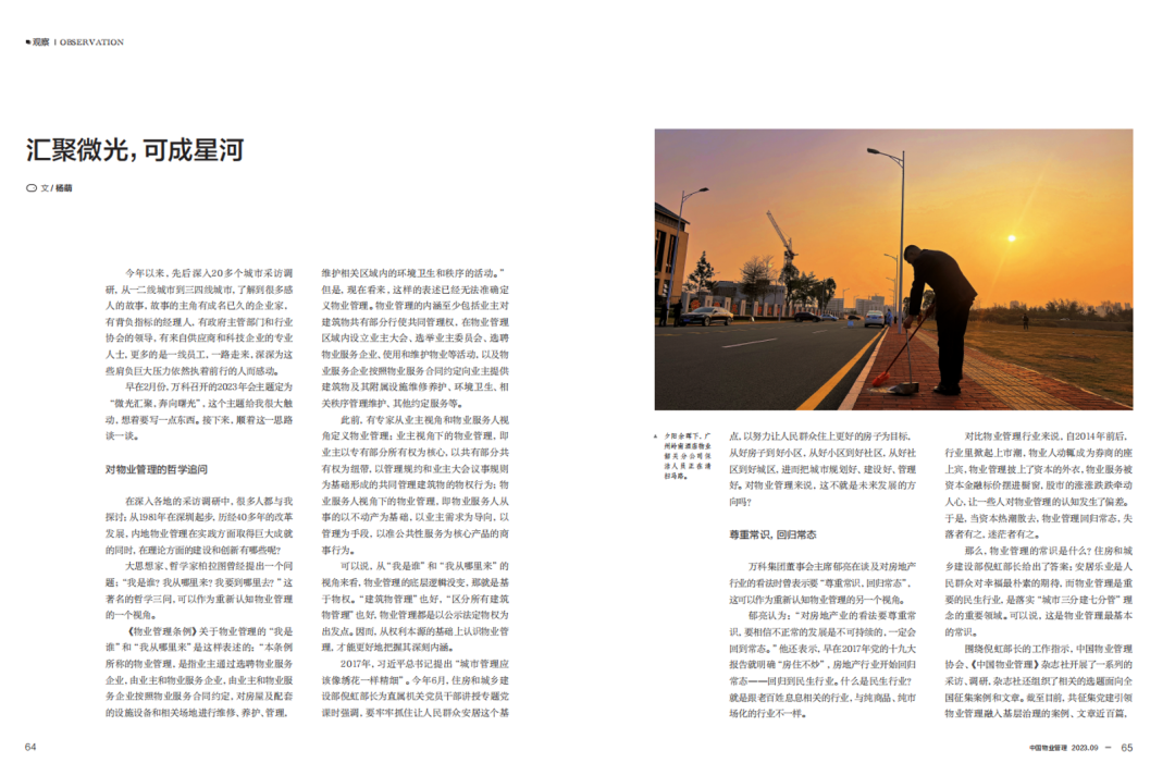 本期卷首语,中国物业管理协会会长王志宏就打造思想高地、科技赋能服务、深化产业链合作三个层面,打造好中国物博会平台,赋能行业高质量发展。
