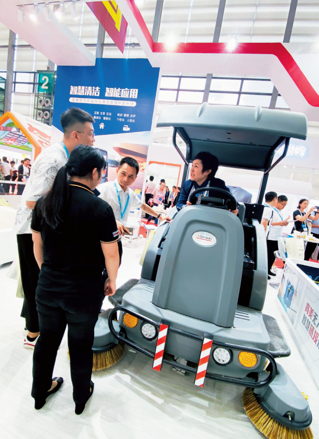本文作者在中国物博会上体验行业新科技,坐在扫地车驾驶座上与工作人员共同探讨“智慧清洁,智能应用”。