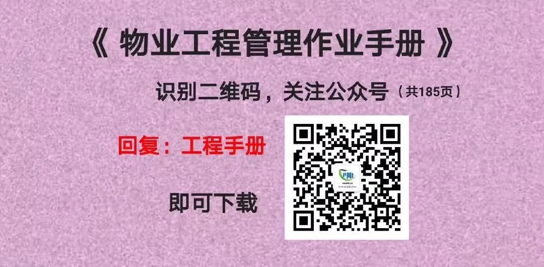 👇点击阅读原文,百部免费资料👇 往期精彩回顾 ▶ 物业呼吁:楼上楼下邻居,请文明使用下水管道! ▶ 电梯有盲区!16个惨痛教训!请转业主群 ▶ 我是物业公司,下列问题找物业··· ▶ 自己买的车位,为什么还要交车位管理费? ▶ 一次说清!你交的物业费包括啥?不包括啥? ▶ 业主经常问的14个问题,《民法典》里有答案 ▶ 致业主:房子虽然是您的但是这10个地方绝对不能动! 1、免费下载 | 物业保洁作业规范和品控、基本知识培训 2、免费下载 | 物业经理必备—365天超级管理手册【354页】 3、免费下载 | 物业服务早期介入【382页】 4、免费下载 | 垃圾分类管理PPT培训课件(含管理制度) 5、免费下载 | 实用干货!物业工程师手册(上册)393页 6、免费下载 | 超全!物业公司绩效管理(制度+表格 )【296页】 7、免费下载 | 【值得借鉴、收藏】物业服务标书大全—96个标书 8、免费下载 | 物业公司之精益管理【含各部门工作流程、应急预案】 9、免费下载 | 实用!物业服务各类合同大全【32套】 10、免费下载 | 物业服务礼仪标准培训PPT【66页】 11、免费下载 | 【干货PPT】物业管理培训课程全讲206页 12、免费下载 | 商场、超市保洁服务手册、方案、合同、标准 13、免费下载 | 实用!办公大楼物业管理服务投标书【222页】 14、免费下载 | 【干货PPT】标杆物业管理培训课件—现场管理 15、免费下载 | 实用!物业装修管理培训PPT(含常用表格文件) 16、免费下载 | 超全!物业管理制度与岗位职责范本大全 17、免费下载 | 物业员工服务礼仪及沟通技巧培训课件 【245页】 18、免费下载 | 向标杆物业学习!万科物业全套作业指导文件【419个文件】 19、免费下载 | 【干货PPT】物业公司创优材料申报72页 20、免费下载 | 商务写字楼物业管理投标文件【177页】 21、免费下载 | 干货:万科物业职能管理体系文件【45个】 22、免费下载 | 【干货PPT】万科员工行为规范BI培训课件80页 23、免费下载 | 物业防汛大全(含各类应急预案、温馨提示、总结、提示语) 24、免费下载 | 物业标准管理大全(含住宅小区、高层、写字楼管理、业主公约) 25、免费下载 | 实用!高层建筑消防安全隐患PPT培训课件 微信 |电话:199 0636 8688 王老师 微信 |电话:188 0636 7288 李老师 全国客户服务热线:400 8899 681 扫描二维码加我微信 点击 “阅读原文” 百部免费物业资料