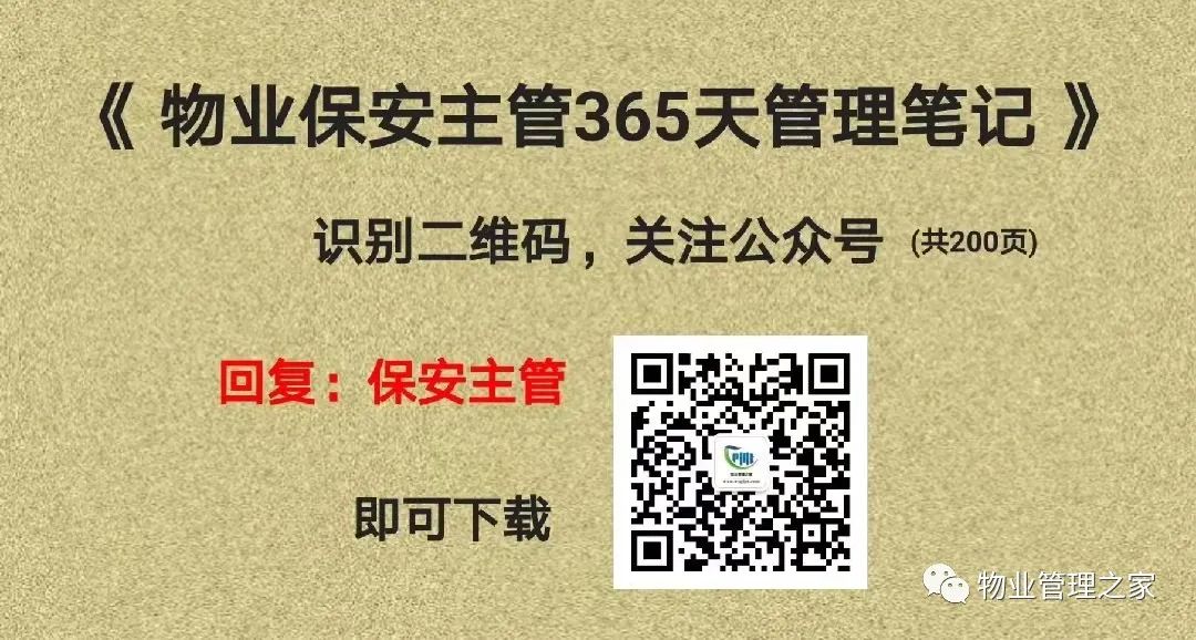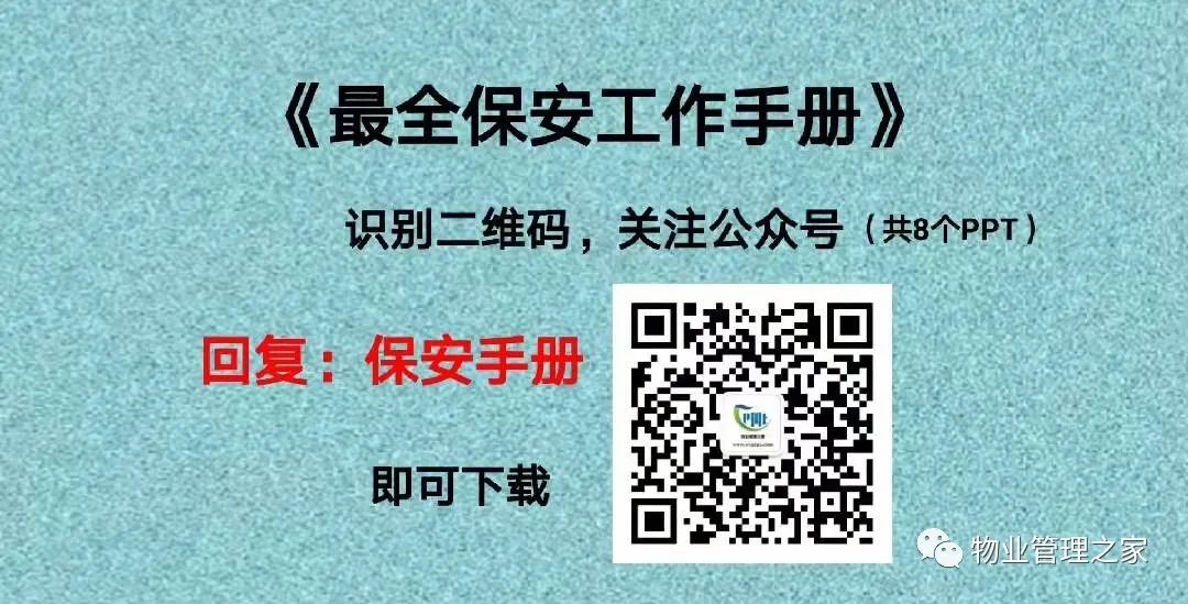 👇点击阅读原文,百部免费资料👇 往期精彩回顾 ▶ 物业呼吁:楼上楼下邻居,请文明使用下水管道! ▶ 电梯有盲区!16个惨痛教训!请转业主群 ▶ 我是物业公司,下列问题找物业··· ▶ 自己买的车位,为什么还要交车位管理费? ▶ 一次说清!你交的物业费包括啥?不包括啥? ▶ 业主经常问的14个问题,《民法典》里有答案 ▶ 致业主:房子虽然是您的但是这10个地方绝对不能动! 1、免费下载 | 物业保洁作业规范和品控、基本知识培训 2、免费下载 | 物业经理必备—365天超级管理手册【354页】 3、免费下载 | 物业服务早期介入【382页】 4、免费下载 | 垃圾分类管理PPT培训课件(含管理制度) 5、免费下载 | 实用干货!物业工程师手册(上册)393页 6、免费下载 | 超全!物业公司绩效管理(制度+表格 )【296页】 7、免费下载 | 【值得借鉴、收藏】物业服务标书大全—96个标书 8、免费下载 | 物业公司之精益管理【含各部门工作流程、应急预案】 9、免费下载 | 实用!物业服务各类合同大全【32套】 10、免费下载 | 物业服务礼仪标准培训PPT【66页】 11、免费下载 | 【干货PPT】物业管理培训课程全讲206页 12、免费下载 | 商场、超市保洁服务手册、方案、合同、标准 13、免费下载 | 实用!办公大楼物业管理服务投标书【222页】 14、免费下载 | 【干货PPT】标杆物业管理培训课件—现场管理 15、免费下载 | 实用!物业装修管理培训PPT(含常用表格文件) 16、免费下载 | 超全!物业管理制度与岗位职责范本大全 17、免费下载 | 物业员工服务礼仪及沟通技巧培训课件 【245页】 18、免费下载 | 向标杆物业学习!万科物业全套作业指导文件【419个文件】 19、免费下载 | 【干货PPT】物业公司创优材料申报72页 20、免费下载 | 商务写字楼物业管理投标文件【177页】 21、免费下载 | 干货:万科物业职能管理体系文件【45个】 22、免费下载 | 【干货PPT】万科员工行为规范BI培训课件80页 23、免费下载 | 物业防汛大全(含各类应急预案、温馨提示、总结、提示语) 24、免费下载 | 物业标准管理大全(含住宅小区、高层、写字楼管理、业主公约) 25、免费下载 | 实用!高层建筑消防安全隐患PPT培训课件 微信 |电话:199 0636 8688 王老师 微信 |电话:188 0636 7288 李老师 全国客户服务热线:400 8899 681 扫描二维码加我微信 点击 “阅读原文” 百部免费物业资料