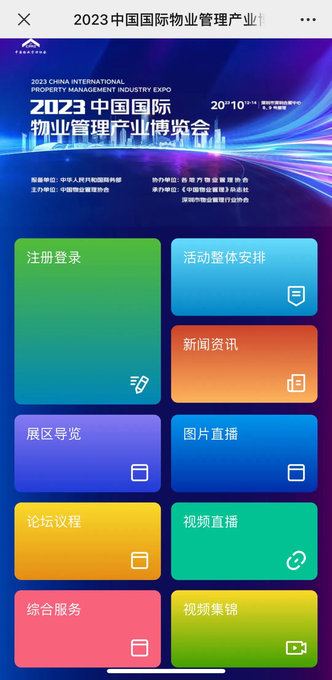 视频直播:观看2023中国物博会开幕式、平行论坛视频直播。(所有直播结束后不进行回放。整体活动结束后,主办方将通过中国物业管理协会视频号、微信号陆续进行视频推送,敬请关注。)