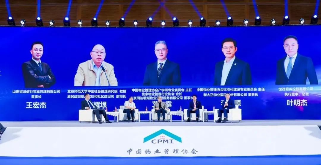 山东省物业管理协会轮值会长、山东省诚信行物业管理有限公司董事长王宏杰,北京师范大学中国社会管理研究院教授、原民政部基层政权和社区建设司副司长朱耀垠,中国物业管理协会产学研专业委员会主任、北京物业管理行业协会会长、北京闻达敏斯物业管理服务有限公司董事长艾白露,中国物业管理协会标准化建设专业委员会主任、新大正物业集团股份有限公司董事长李茂顺,世茂服务控股有限公司执行董事、总裁叶明杰围绕“发展高质量 服务新征程”主题,进行了圆桌讨论。
