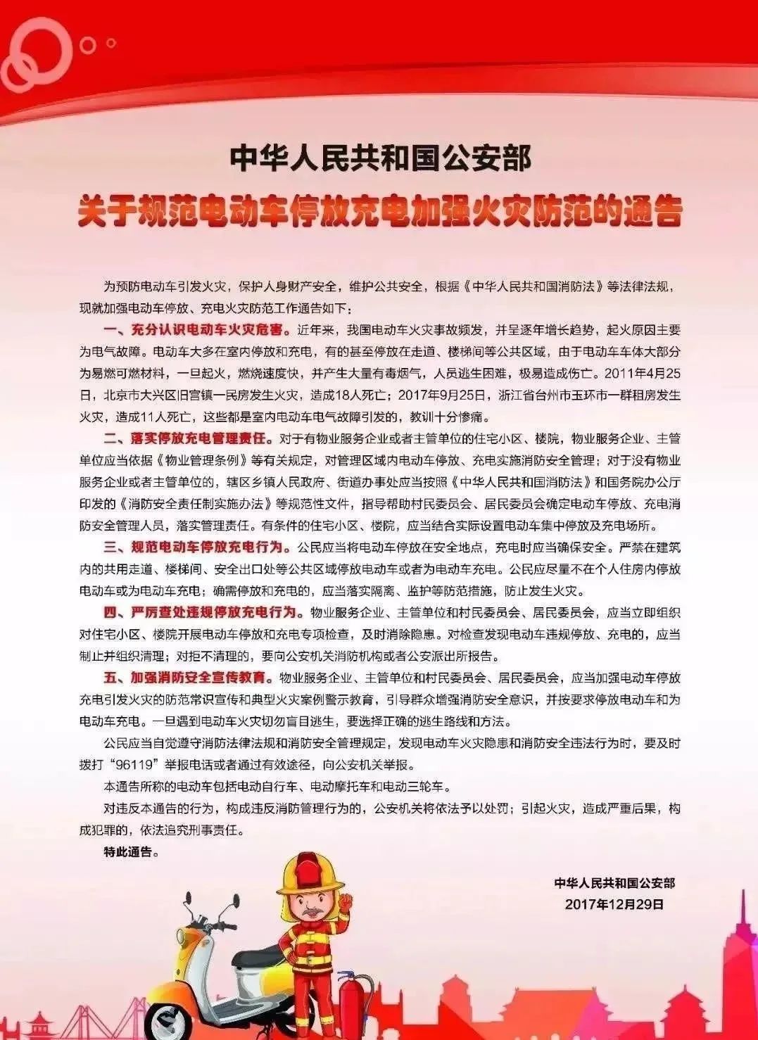 👇点击阅读原文,百部免费资料👇 二、应急管理部《高层民用建筑消防安全管理规定》第三十七条:禁止在高层民用建筑公共门厅、疏散走道、楼梯间、安全出口停放电动自行车或者为电动自行车充电。 第四十七条:违反本规定,有下列行为之一的,由消防救援机构责令改正,对经营性单位和个人处2000元以上10000元以下罚款,对非经营性单位和个人处500元以上1000元以下罚款: (四)未按照规定落实消防控制室值班制度,或者安排不具备相应条件的人员值班的; (七)在高层民用建筑的公共门厅、疏散走道、楼梯间、安全出口停放电动自行车或者为电动自行车充电,拒不改正的。 1、请勿将电动车停放在楼道、走道和楼梯间。 2、请勿在室内或超长时间为电动车充电。 3、请勿购买和使用非标和超标电动车。 4、请勿对电动车加装电池和改装。 5、请勿使用非原装充电器为电动车充电。 6、请勿在电动车周边放置易燃品和使用明火。 往彩回顾 ▶小区住户一定要看看,电梯为什么经常坏? ▶最新保安服务规范 ▶“交了物业费,物业为我家干了什么?” ▶业主委员会、业主大会成立超全攻略!及上墙制度【附38个实用表格】 ▶物业费催收全套指导文件—实用收藏! ▶电梯有盲区!16个惨痛教训!请转业主群 ▶物业关于统一清理楼道堆积物的通知 点击图片,查看证书介绍 微信 |电话:188 0636 7288 王老师 微信 |电话:199 0636 8688 刘老师 全国客户服务热线:400 8899 681 扫描二维码加我微信 点击 “阅读原文” 百部免费物业资料