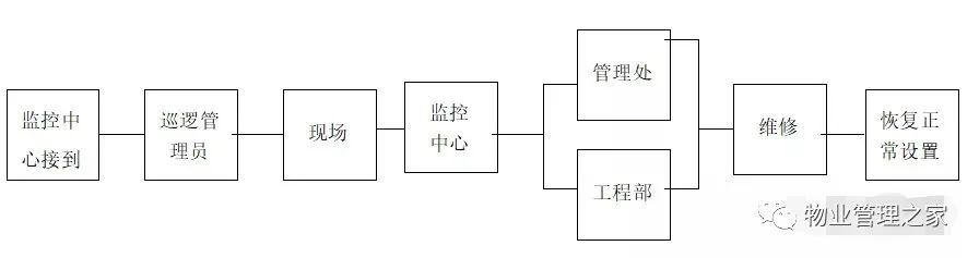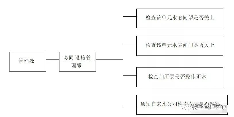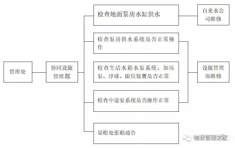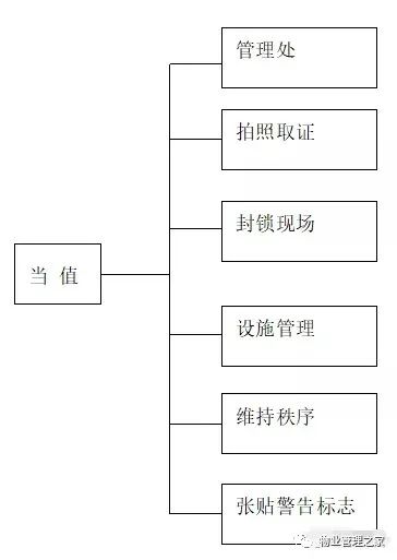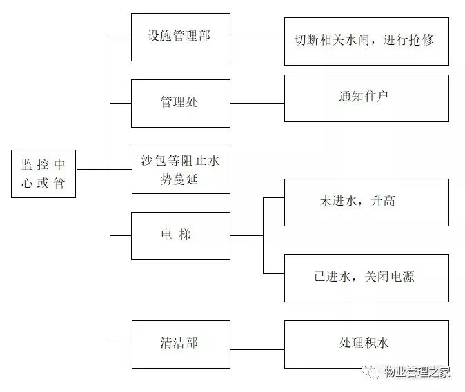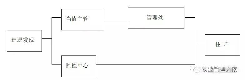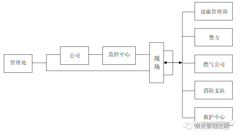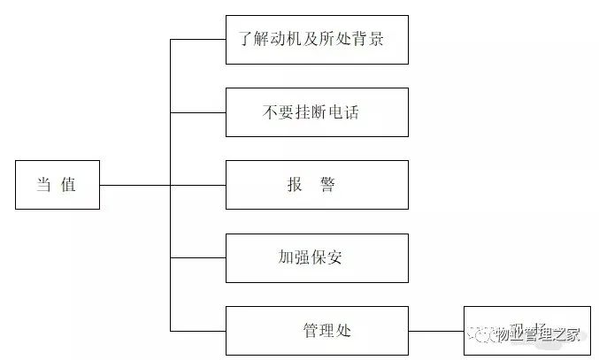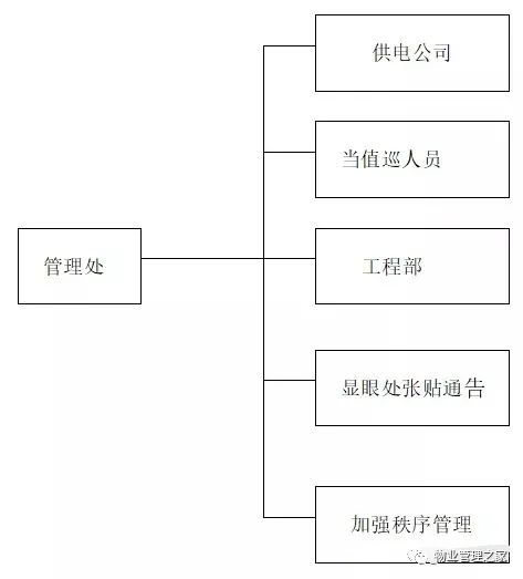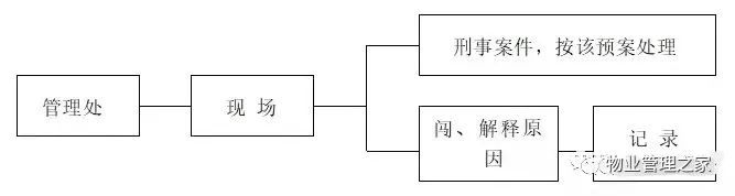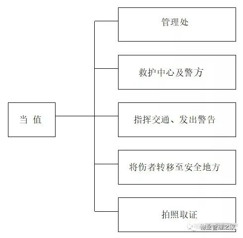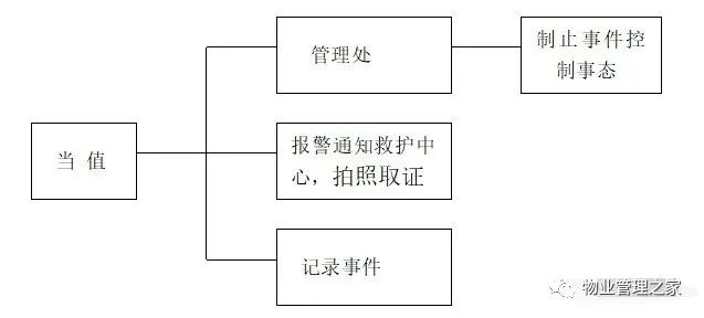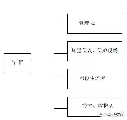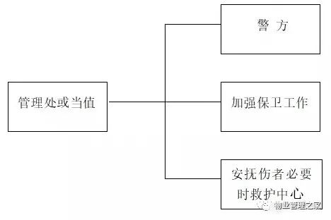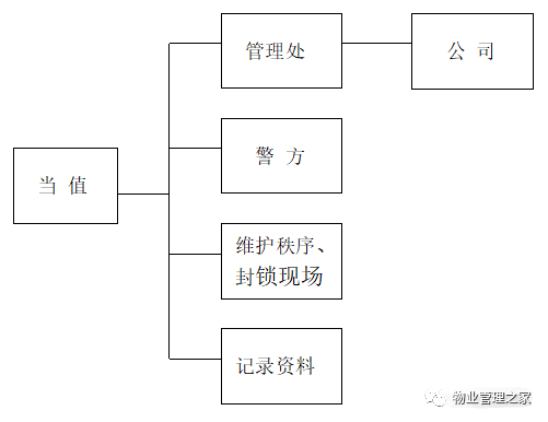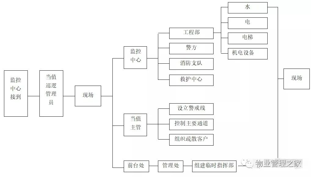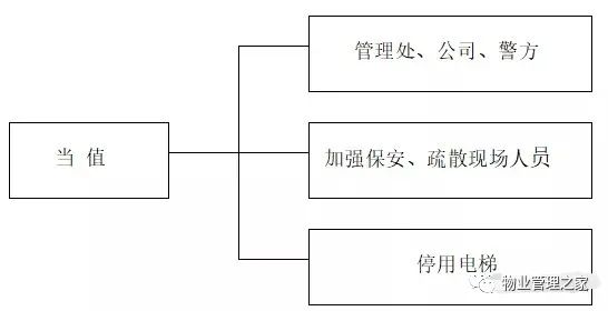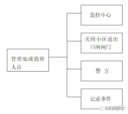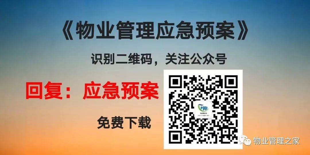 👇点击阅读原文,百部免费资料👇 01 燃气泄漏处理方案 图表说明: 文字说明: 1、立即通知当值巡逻人员前往事发现场了解情况。(不少于2名员工) 2、立即通知管理处,上报主管。 3、上报公司。 4、视情况通知各方至现场采取救急措施。 注:前往、到达事发现场须知 02 火警应急处理方案 图表说明: 文字说明: 1、当监控中心接收到消防设备报警或管理员当值报警时,立即通知当值巡逻人员赶至现场核实。 2、到达现场后及时反馈监控中心,报清:单元、机房、公共走道、设备夹层、燃烧物、火势大小及伤员情况等,并仔细全面地检查现场。若火警成立,立即通知当值主管及监控中心并使用该楼层的灭火器材先投入灭火工作,并帮助火灾现场做好自救工作。 3、监控中心视情况通知各方采取紧急措施:报警时应报清:小区名称、门牌号码、所处路口、燃烧物性质及面积、电话号码、报警人姓名;外岗人员负责及消防队由最近通道进场并根据其需要介绍小区、火警情况,配合做好灭火工作。 4、当值主管接报后调配人手赶赴现场增援并做好如下工作: 5、接警后,立即通知管理处并成立临时救火指挥部,与消防人员配合救火工作;各部须严格执行各项命令(如:迫降电梯、启动、开关各类消防设施、设备等);灭火器材若无法控制火势,应接装消防栓、水枪,通知总控制室人员启动消防泵进行扑救。 注: 1、火灾扑灭后作好现场保护工作并配合检查,调查失火原因,统计火灾损失,并作好书面报告逐级上报。 2、将扑救情况、结果和善后处理情况作好书面报告逐级上报。 3、设施管理部接报后 4、疏散客人次序:着火层 → 着火层以上楼面 → 着火层以下楼面 5、疏散客人时注意: 6、火场警戒安排: 03 火警误报应急处理方案 图表说明: 文字说明: 1、监控中心显示屏显示项目内任何区域有火警自动报警或接他人报警时,立即通知当值巡逻人员至现场查看,全面仔细检查。物业管理圈。(监控中心人员报警必须准确清楚:单元、机房、公共走道设备夹层、警铃、消防栓水流、水喷淋等) 2、巡逻人员至现场必须全面仔细检查,查明原因后,将结果及时反馈监控中心。 3、监控中心人员接报后,如为火警误报,将报警复位;如为火警,按火警预案处理。 4、如果误报频繁、重复,并确认属系统故障,应予以暂时隔离,并通知管理处及工程部及时安排维修工作。 注:在某一系统(区域)隔离期间,必须安排加强日常巡检工作,以策安全。 04 消防设备人为损坏处理方案 图表说明: 文字说明: 1、楼层手动报警玻璃被击碎后,消防中心立即有报警回音。 2、接警后立即通知当值主管。 3、主管派员工至现场检查。 4、至现场后,及时将检查情况反馈监控中心: 注:如发现肇事者,应对其进行消防法规教育并按规定予以处罚,并赔偿维修费用,记录备案。 05 项目漏水(水浸)应急处理程序 图表说明: 文字说明: 1、工程部收报后,立即关闭相关水闸,切断电源,进行抢修。 2、(如切断水源而引起住户断水)管理处接报后,应及时通知住户。 3、组织人员利用沙包阻止水势蔓延到其它地方。 4、如果漏水地区的电梯未进水,将电梯升高并暂停使用;如果已进水,则将电梯电源关闭,禁止进入,待现场清理后再检修电梯。 5、通知清洁部处理积水,清理现场。并防止水浸区域进一步扩大。 06 发生停电及电力故障应急处理方案 (一)计划停电 图表说明: 文字说明: 1、管理处在收到供电部门发出的停电通知后,应在停电日前三天在显眼处张贴通告,通知住户。(通知详细写明:停电日期、恢复供电日期、是否暂停电梯及暂停时间,通知各住户停电期间将所有电器关闭) 2、通知设施管理部准备突发故障及配合进行设备养护。 3、安排员工在停电前将电梯升上后关闭,以免停电时困人。 4、准备备用物资如电筒、切勿点燃蜡烛。(在停电日前检修通道应急照明灯是否完好) 注:停电期间加强保安,以免不法分子有机可乘;电力恢复时,检查小区各设备是否正常运作;停电时应将所有电器插座拔掉。(若电梯困人,按该预案处理。) 图表说明: 文字说明: 1、接报后至现场察看,向业主解释其单元停电并非在项目供电出现问题。 2、通知设施管理部至现场检查故障原因,排除一般问题。 3、若原因杂难,工程部不能修理,应立即聘用专业水电公司处理,尽力为住户解决问题。 (三)电力突然中断 图表说明: 文字说明: 1、接报后立即致电供电公司查询,是否供电局出问题,如是则应按预案(1)处理。 2、通知当值巡逻人员,到停电现场察看正确位置,及时反馈监控中心。 3、通知设施管理部察看停电区域停电原因及进行抢修;在电力恢复后,到场检查受影响的公共电器、设备是否则恢复正常操作,同时详细巡楼一次,确保各项设备已恢复正常。 4、接报后在显眼处张贴停电通知,告知住户,以安定住户。 5、接报后,加强保安: 注:事后查明有关停电原因,以书面报告公司。 07 电梯困人应急处理程序 图表说明: 文字说明: 1、 a)若有乘客被困在电梯内,详细询问被困人有关情形,做出相应应急措施及通知管理处报告电梯的正确位置保持联系。 b)被困者内如有小孩、老人、孕妇或人多空气不足的,须特别留意。若有身体不适须立即离开的、而保养公司仍未有人在场,应立即与保养公司维修点说明原因,并立即通知警方和消防人员协助。 2、 立即致电所属保养公司的24小时紧急维修