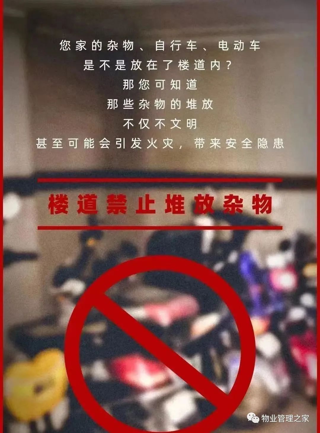 爱与责任 请对房间外围进行自查,清理楼道内、安全步梯、管道井、阳台等位置的全部个人物品,确保楼内消防安全;当物业对您的杂物进行清理时,万望配合,营造安全氛围,物业没有私心;安全无小事,更不能“事不关己高高挂起”,相信被您好心劝勉的人会对自己的行为有所审视;园区消防安全需要您的关注与配合,发现消防隐患,可及时与物业联系,消灭火患,造福子孙。