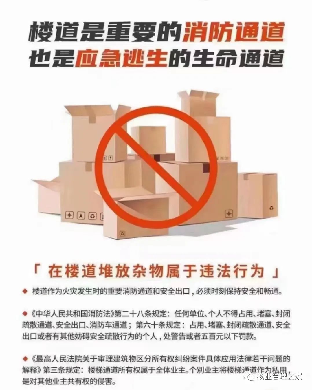 👇点击阅读原文,百部免费资料👇小区是我家爱护靠大家和谐小区,美丽家园你我共建,一起共享下面这些行为不能有!01损坏房屋承重结构、主体结构;02侵占、损坏共用部位、共用设施设备;03擅自占用、挖掘物业管理区域内的道路、场地;04违法搭建建筑物、构筑物、障碍物,破坏或者擅自改变房屋外观;05违反安全管理规定存放易燃、易爆、剧毒、腐蚀性、放射性等危险物品;06擅自架设电线、电缆;07高空抛物、随意弃置垃圾、排放污水;08在公共走道、楼梯间、门厅内存放电动自行车或者为其充电;09排放有毒、有害等污染环境的物质,露天烧烤、露天焚烧杂物;10制造超过规定标准的噪声或者影响邻居采光通风;11侵占绿地、毁坏绿化植物和绿化设施;12占用、堵塞、封闭消防通道、消防登高面,损坏消防设施及器材;13在建筑物、构筑物上乱涂写、乱刻画、乱张贴,楼道、门厅、电缆井内堆放杂物;14擅自改变房屋用途,将住宅变为非住宅,从事餐饮、生产加工、歌舞娱乐等经营活动;15使用地锁、石墩、栅栏等障碍物占用公共道路、公共停车泊位,违反规定停放车辆;16违反规定饲养动物,干扰他人正常生活;17利用房屋从事危害公共安全、公共利益和侵害他人正当权益的活动;18法律、法规和业主公约或者管理规约禁止的其他行为。往期精彩回顾▶ 物业呼吁:楼上楼下邻居,请文明使用下水管道!▶ 电梯有盲区!16个惨痛教训!请转业主群▶ 我是物业公司,下列问题找物业···▶ 自己买的车位,为什么还要交车位管理费?▶ 一次说清!你交的物业费包括啥?不包括啥?▶ 业主经常问的14个问题,《民法典》里有答案▶ 致业主:房子虽然是您的但是这10个地方绝对不能动!END1、免费下载 | 物业保洁作业规范和品控、基本知识培训2、免费下载 | 物业经理必备—365天超级管理手册【354页】3、免费下载 | 物业服务早期介入【382页】4、免费下载 | 垃圾分类管理PPT培训课件(含管理制度)5、免费下载 | 实用干货!物业工程师手册(上册)393页6、免费下载 | 超全!物业公司绩效管理(制度+表格 )【296页】7、免费下载 | 【值得借鉴、收藏】物业服务标书大全—96个标书8、免费下载 | 物业公司之精益管理【含各部门工作流程、应急预案】9、免费下载 | 实用!物业服务各类合同大全【32套】10、免费下载 | 物业服务礼仪标准培训PPT【66页】11、免费下载 | 【干货PPT】物业管理培训课程全讲206页12、免费下载 | 商场、超市保洁服务手册、方案、合同、标准13、免费下载 | 实用!办公大楼物业管理服务投标书【222页】14、免费下载 | 【干货PPT】标杆物业管理培训课件—现场管理15、免费下载 | 实用!物业装修管理培训PPT(含常用表格文件)16、免费下载 | 超全!物业管理制度与岗位职责范本大全17、免费下载 | 物业员工服务礼仪及沟通技巧培训课件 【245页】18、免费下载 | 向标杆物业学习!万科物业全套作业指导文件【419个文件】19、免费下载 | 【干货PPT】物业公司创优材料申报72页20、免费下载 | 商务写字楼物业管理投标文件【177页】21、免费下载 | 干货:万科物业职能管理体系文件【45个】22、免费下载 | 【干货PPT】万科员工行为规范BI培训课件80页23、免费下载 | 物业防汛大全(含各类应急预案、温馨提示、总结、提示语)24、免费下载 | 物业标准管理大全(含住宅小区、高层、写字楼管理、业主公约)25、免费下载 | 实用!高层建筑消防安全隐患PPT培训课件 微信 |电话:199 0636 8688 王老师 微信 |电话:188 0636 7288 李老师全国客户服务热线:400 8899 681扫描二维码加我微信点击 “阅读原文” 百部免费物业资料