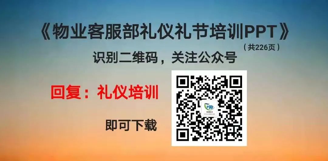 点击阅读原文,百部免费资料 往期精彩回顾 ▶ 物业呼吁:楼上楼下邻居,请文明使用下水管道! ▶ 电梯有盲区!16个惨痛教训!请转业主群 ▶ 我是物业公司,下列问题找物业··· ▶ 自己买的车位,为什么还要交车位管理费? ▶ 一次说清!你交的物业费包括啥?不包括啥? ▶ 业主经常问的14个问题,《民法典》里有答案 ▶ 致业主:房子虽然是您的但是这10个地方绝对不能动! 1、免费下载 | 物业保洁作业规范和品控、基本知识培训 2、免费下载 | 物业经理必备—365天超级管理手册【354页】 3、免费下载 | 物业服务早期介入【382页】 4、免费下载 | 垃圾分类管理PPT培训课件(含管理制度) 5、免费下载 | 实用干货!物业工程师手册(上册)393页 6、免费下载 | 超全!物业公司绩效管理(制度+表格 )【296页】 7、免费下载 | 【值得借鉴、收藏】物业服务标书大全—96个标书 8、免费下载 | 物业公司之精益管理【含各部门工作流程、应急预案】 9、免费下载 | 实用!物业服务各类合同大全【32套】 10、免费下载 | 物业服务礼仪标准培训PPT【66页】 11、免费下载 | 【干货PPT】物业管理培训课程全讲206页 12、免费下载 | 商场、超市保洁服务手册、方案、合同、标准 13、免费下载 | 实用!办公大楼物业管理服务投标书【222页】 14、免费下载 | 【干货PPT】标杆物业管理培训课件—现场管理 15、免费下载 | 实用!物业装修管理培训PPT(含常用表格文件) 16、免费下载 | 超全!物业管理制度与岗位职责范本大全 17、免费下载 | 物业员工服务礼仪及沟通技巧培训课件 【245页】 18、免费下载 | 向标杆物业学习!万科物业全套作业指导文件【419个文件】 19、免费下载 | 【干货PPT】物业公司创优材料申报72页 20、免费下载 | 商务写字楼物业管理投标文件【177页】 21、免费下载 | 干货:万科物业职能管理体系文件【45个】 22、免费下载 | 【干货PPT】万科员工行为规范BI培训课件80页 23、免费下载 | 物业防汛大全(含各类应急预案、温馨提示、总结、提示语) 24、免费下载 | 物业标准管理大全(含住宅小区、高层、写字楼管理、业主公约) 25、免费下载 | 实用!高层建筑消防安全隐患PPT培训课件 微信 |电话:199 0636 8688 王老师 微信 |电话:188 0636 7288 李老师 全国客户服务热线:400 8899 681 扫描二维码加我微信 点击 “阅读原文” 百部免费物业资料