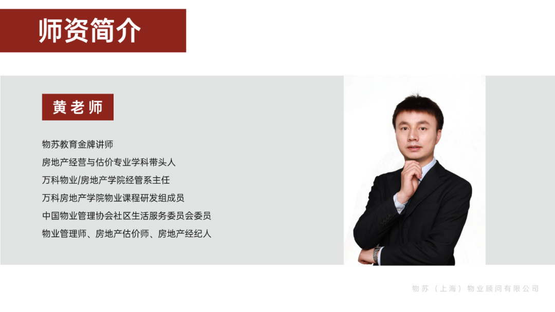 黄老师在万科物业、世联地产、洪泽集团等房企12年管理工作经验,300+企业培训经历;参与编写了《房地产估价理论与实务》、《物业经营管理》、《物业综合管理服务》等书籍;从事物业管理课题研究10余项。
