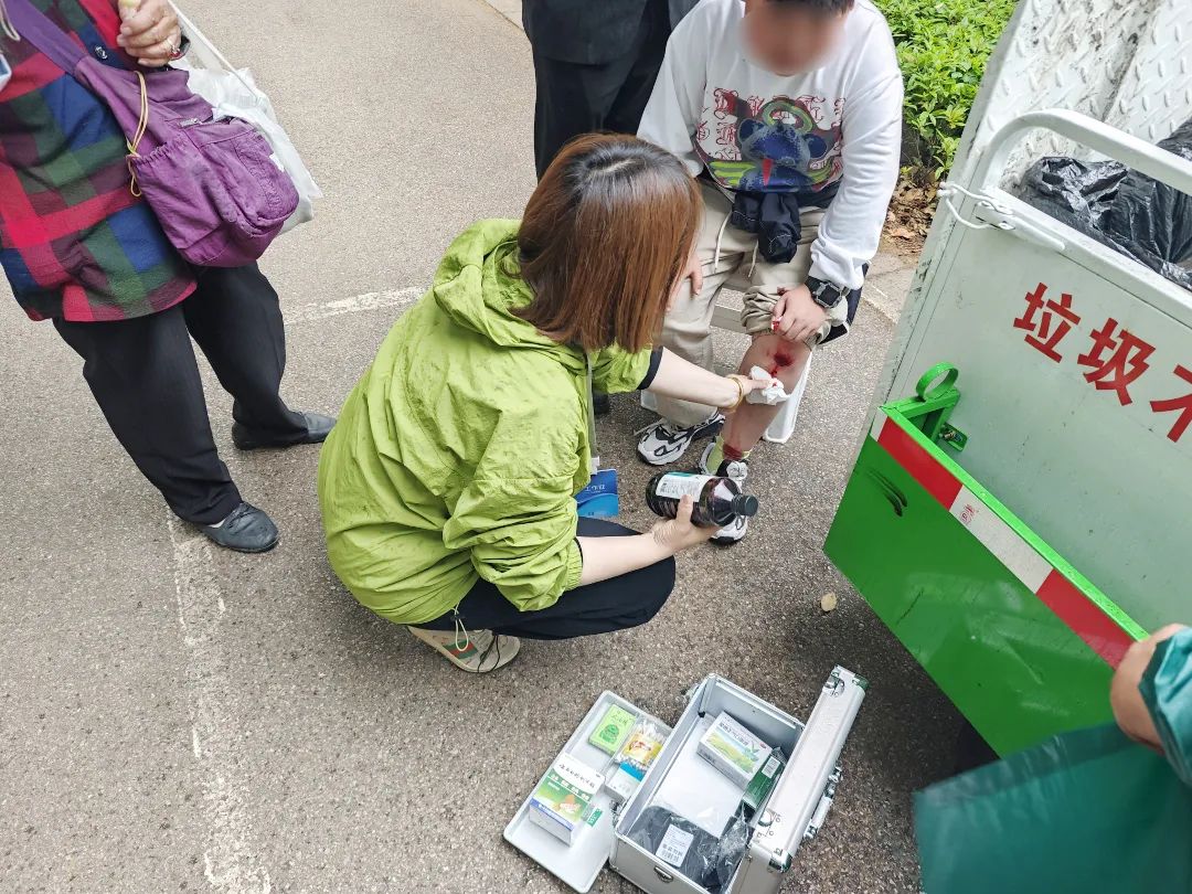 松竹物业红山森林动物园项目部在做好车流引导、秩序维护、卫生保洁等工作的同时,将游客需求放在首位,用服务温暖每位游客。一位小游客不慎在动物园内磕伤了膝盖,血流不止。得知情况后,保洁主管李玲迅速携带医药箱和塑料凳赶到现场。她先让小游客坐下休息,然后用碘伏消毒伤口,并耐心安抚其情绪。待小游客情绪稳定后,她才放心离开。
