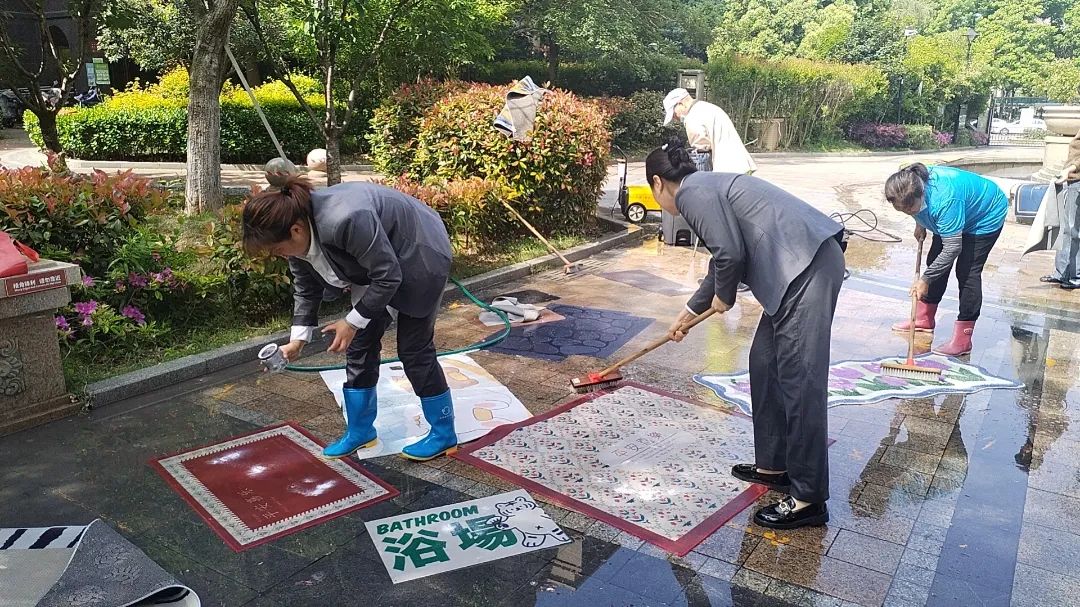 一阵阵轻风吹过,带来初夏的清新与微凉。在这样的日子里,工作人员开始了他们日常而重要的工作——清洗业主家的地垫。一块块地垫,承载了无数双鞋底的印记,它像是一位沉默的守护者,静静躺在那里,等候着着每个家庭的成员归来。然而,时间的流逝也让它蒙上了尘埃,就在这时,物业的工作人员,带着他们的工具,开始了这项看似不起眼,却意义非凡的任务。他们先是细心地将地垫整齐铺好,仿佛对待一件珍贵的艺术品。接着,用水管细细地冲洗,水流与泡沫交织,带走了累积的尘埃与污垢。阳光下飞溅的水珠仿佛都带着欢快的旋律,与物业人员忙碌的身影构成了一幅温馨的画面。随后,他们用刷子轻轻刷洗,每一下都那么仔细。清洗完毕,晾晒在阳光下的地垫逐渐恢复了原有的色彩,柔软而干净,仿佛被赋予了新生。当它再次被铺回原位,迎接归家的人们,不仅带来了脚下的舒适,更传递了一份家的温馨与安心。