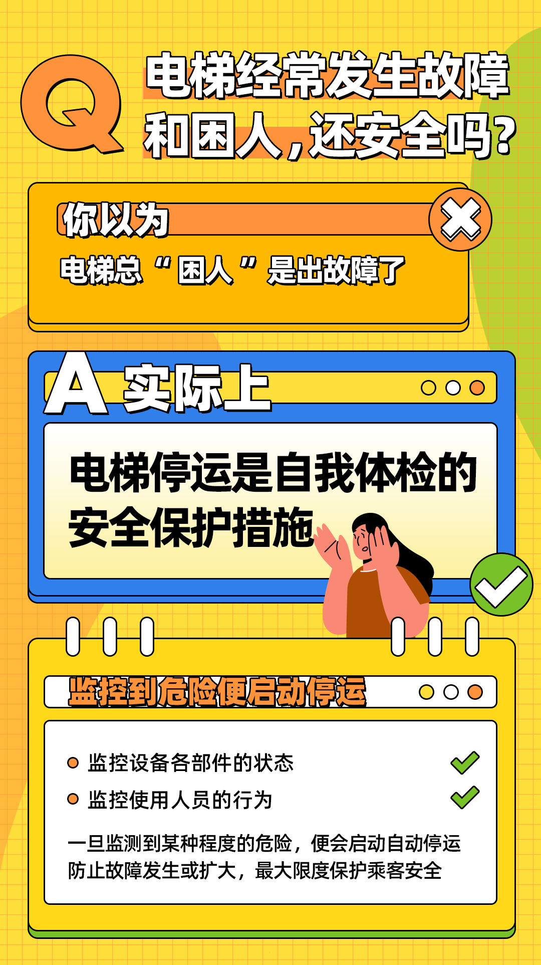 许多居民乘坐电梯时总会担心“如果出现故障,电梯不会突然摔下去吧?”其实,电梯有3重安全防护措施,防止从高处高速坠落: