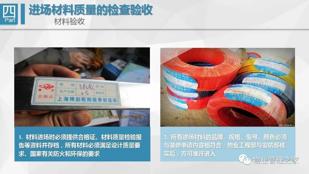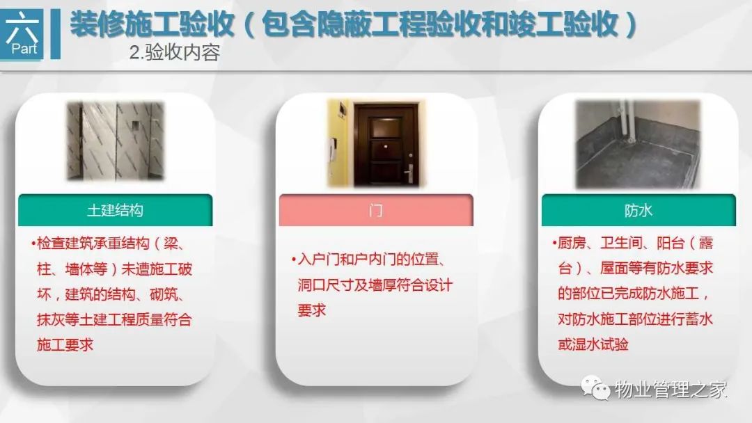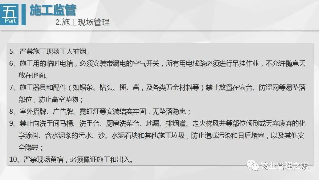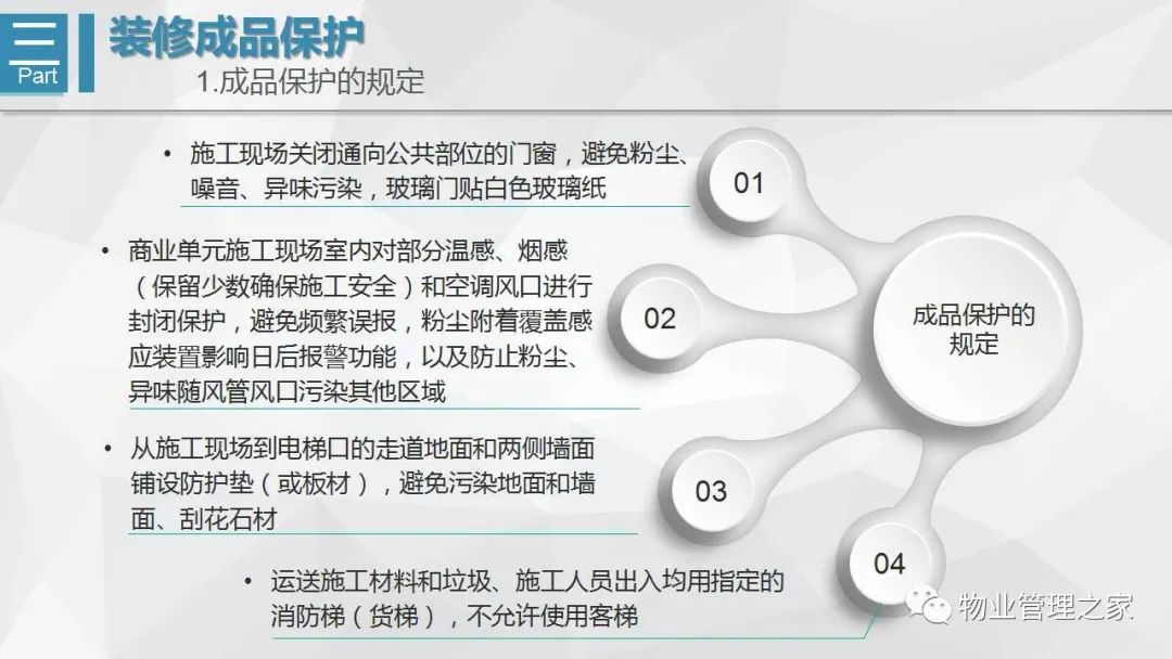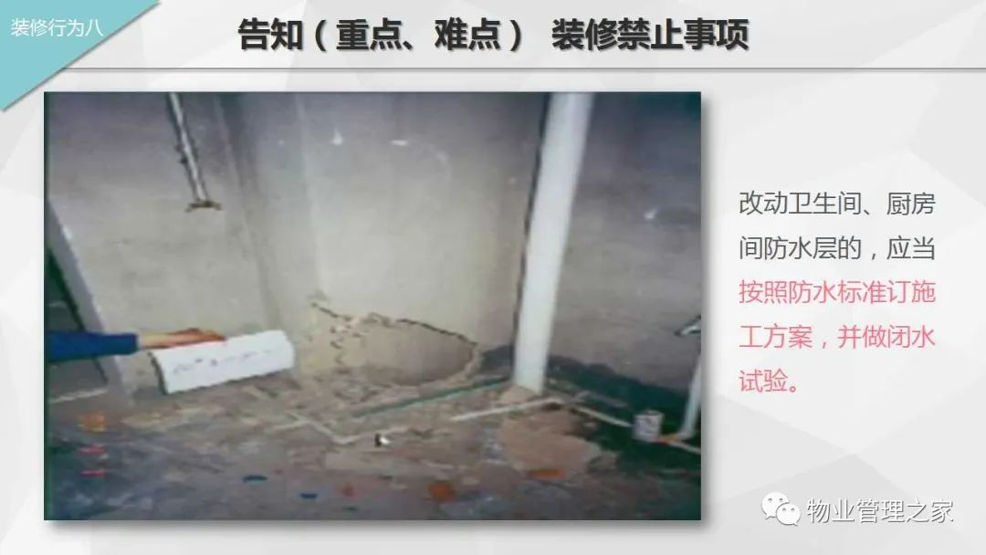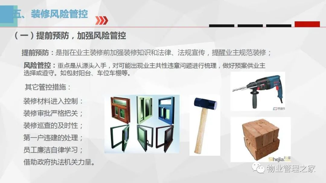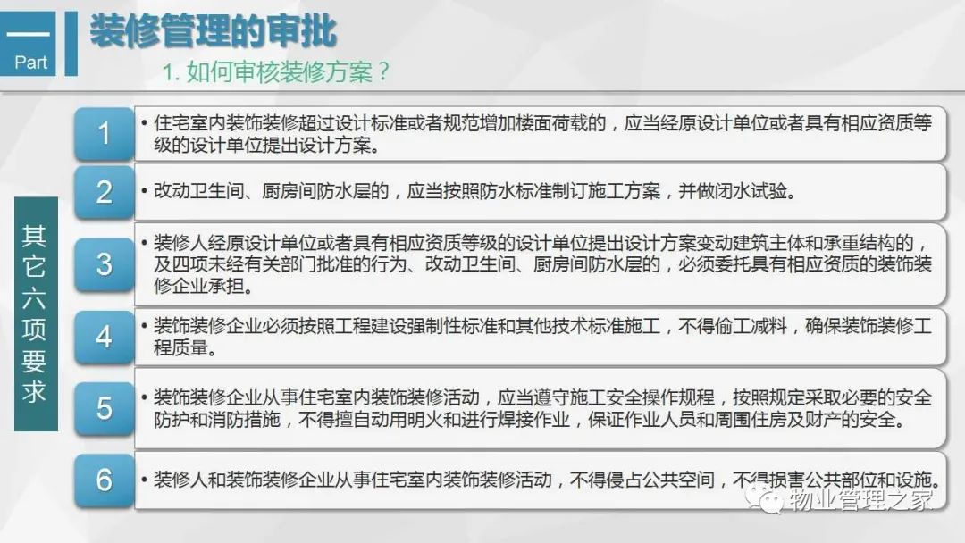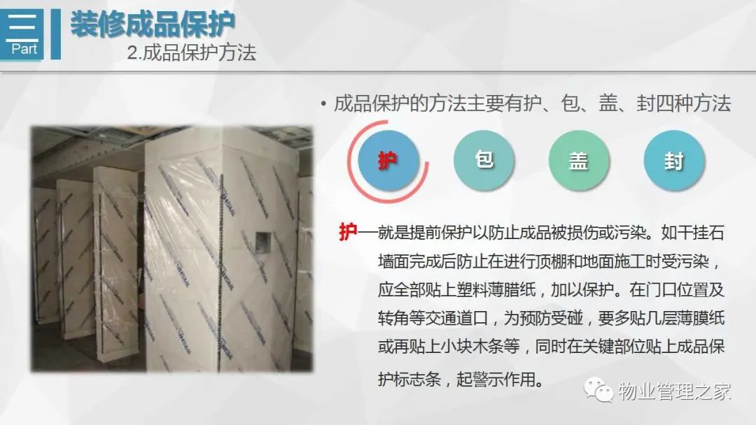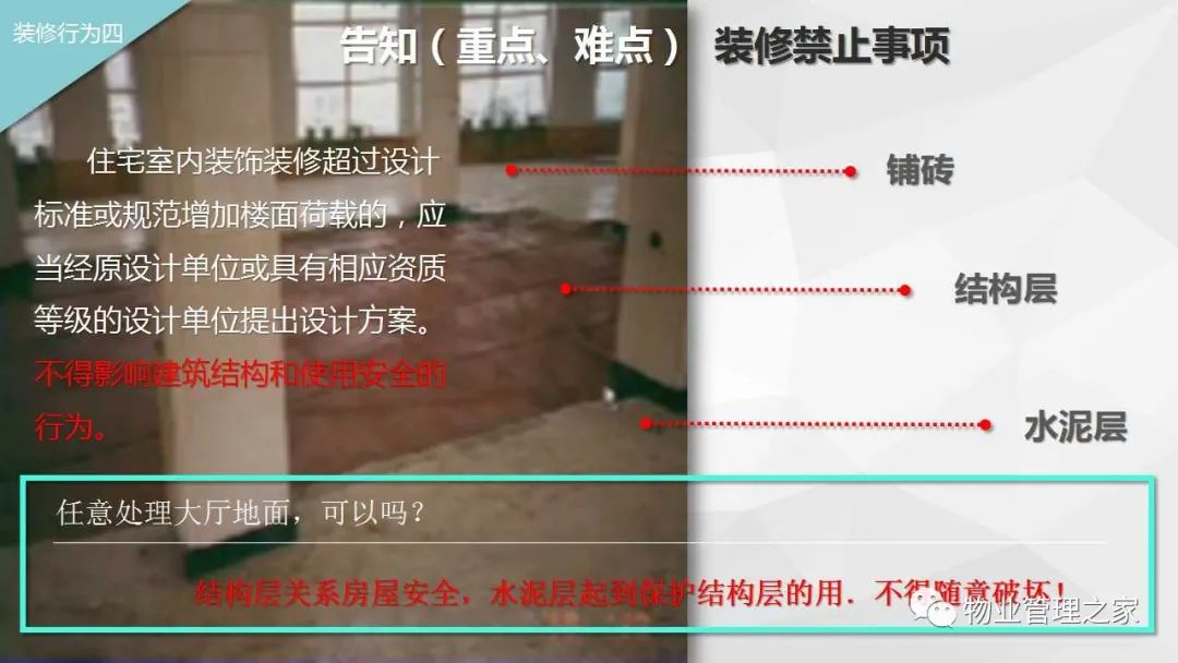 PPT共107页因微信文章篇幅所限内容无法通过微信文章分享给大家免费下载方法:关注《物业管理之家》微信公众号公众号对话框回复:装修课件即可收到下载资料1、免费下载 | 物业保洁作业规范和品控、基本知识培训2、免费下载 | 物业经理必备—管理手册3、免费下载 | 物业公司创优材料申报4、免费下载 | 《 民法典 》高空抛物PPT课件大全5、免费下载 | 实用干货!物业工程师手册6、免费下载 | 高层建筑消防安全隐患PPT培训课件7、免费下载 | 物业服务标书大全—96个标书8、免费下载 | 物业公司之精益管理【含各部门工作流程、应急预案】9、免费下载 | 物业服务各类合同大全【32套】10、免费下载 | 物业服务礼仪标准培训PPT11、免费下载 | 【干货PPT】物业管理培训课程12、免费下载 | 商场、超市保洁服务手册、方案、合同、标准13、免费下载 | 办公大楼物业管理服务投标书14、免费下载 | 标杆物业管理培训课件—现场管理15、免费下载 | 物业装修管理培训PPT(含常用表格文件)16、免费下载 | 实用!物业管理制度与岗位职责17、免费下载 | 物业员工服务礼仪及沟通技巧培训课件 18、免费下载 | 万科物业全套作业指导文件19、免费下载 | 商务写字楼物业管理投标文件20、免费下载 | 万科物业职能管理体系文件【45个】21、免费下载 | 物业防汛大全(含各类应急预案、温馨提示、总结、提示语)22、免费下载 | 物业标准管理大全(含住宅小区、高层、写字楼管理、业主公约) 微信 |电话:199 0636 8688 王老师 微信 |电话:188 0636 7288 李老师全国客户服务热线:400 8899 681扫描二维码加我微信点击“阅读原文”百部免费物业资料