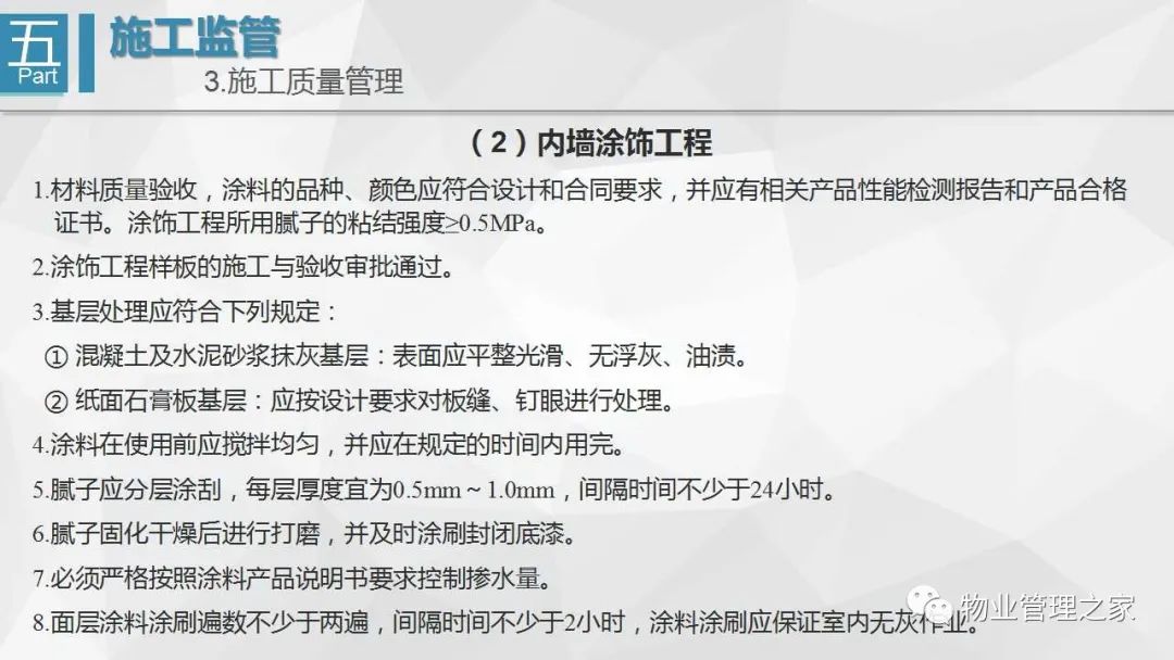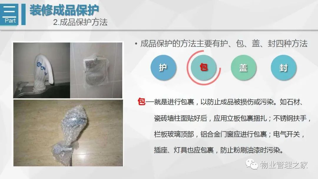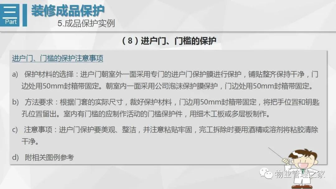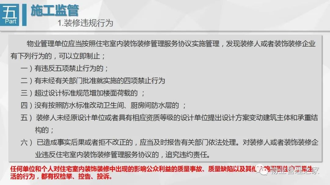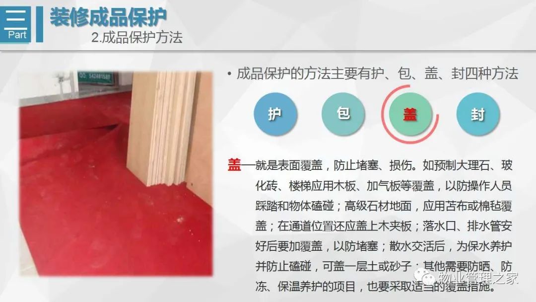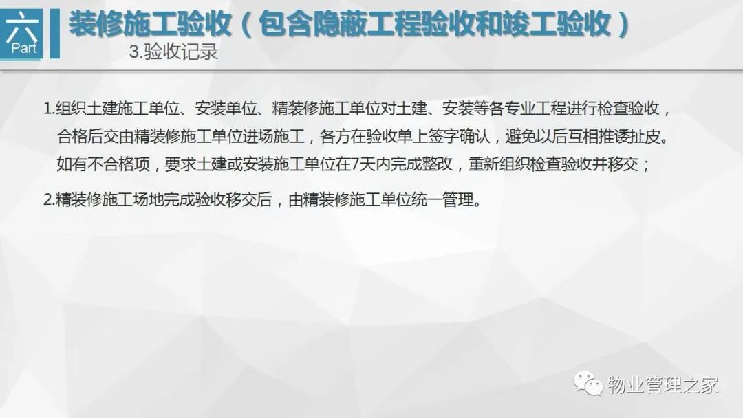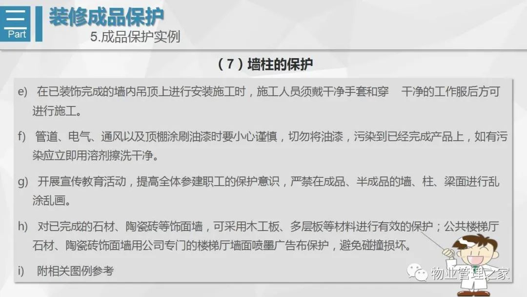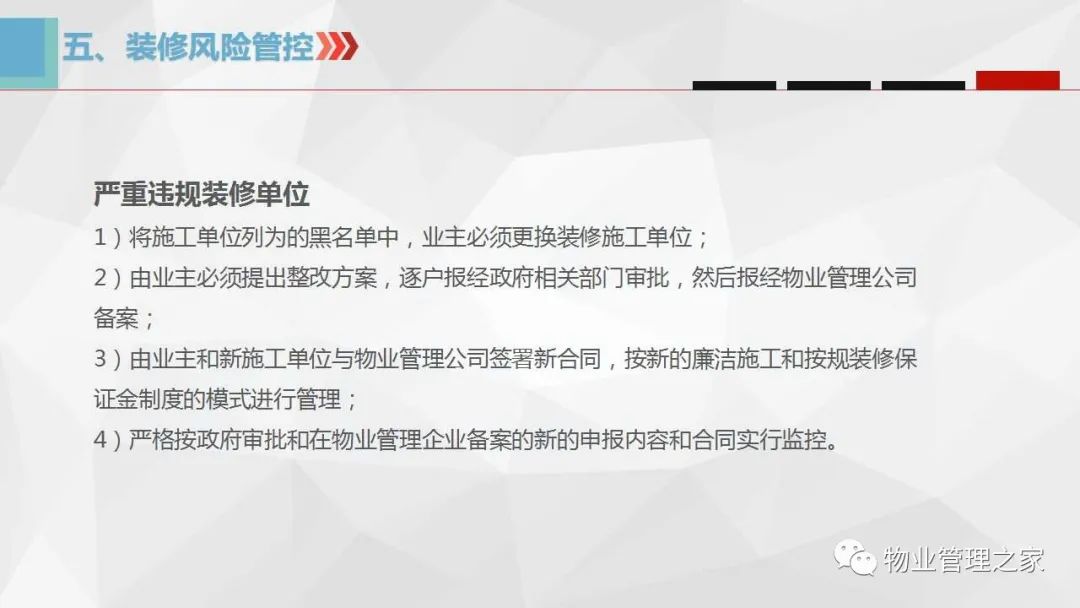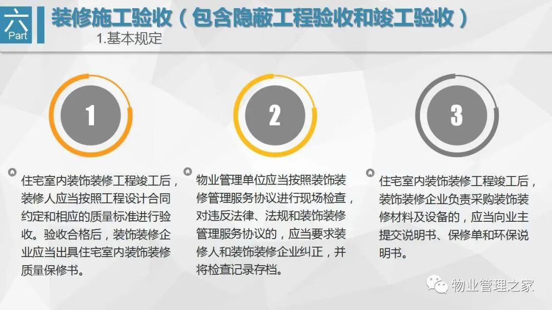 PPT共107页因微信文章篇幅所限内容无法通过微信文章分享给大家免费下载方法:关注《物业管理之家》微信公众号公众号对话框回复:装修课件即可收到下载资料1、免费下载 | 物业保洁作业规范和品控、基本知识培训2、免费下载 | 物业经理必备—管理手册3、免费下载 | 物业公司创优材料申报4、免费下载 | 《 民法典 》高空抛物PPT课件大全5、免费下载 | 实用干货!物业工程师手册6、免费下载 | 高层建筑消防安全隐患PPT培训课件7、免费下载 | 物业服务标书大全—96个标书8、免费下载 | 物业公司之精益管理【含各部门工作流程、应急预案】9、免费下载 | 物业服务各类合同大全【32套】10、免费下载 | 物业服务礼仪标准培训PPT11、免费下载 | 【干货PPT】物业管理培训课程12、免费下载 | 商场、超市保洁服务手册、方案、合同、标准13、免费下载 | 办公大楼物业管理服务投标书14、免费下载 | 标杆物业管理培训课件—现场管理15、免费下载 | 物业装修管理培训PPT(含常用表格文件)16、免费下载 | 实用!物业管理制度与岗位职责17、免费下载 | 物业员工服务礼仪及沟通技巧培训课件 18、免费下载 | 万科物业全套作业指导文件19、免费下载 | 商务写字楼物业管理投标文件20、免费下载 | 万科物业职能管理体系文件【45个】21、免费下载 | 物业防汛大全(含各类应急预案、温馨提示、总结、提示语)22、免费下载 | 物业标准管理大全(含住宅小区、高层、写字楼管理、业主公约) 微信 |电话:199 0636 8688 王老师 微信 |电话:188 0636 7288 李老师全国客户服务热线:400 8899 681扫描二维码加我微信点击“阅读原文”百部免费物业资料