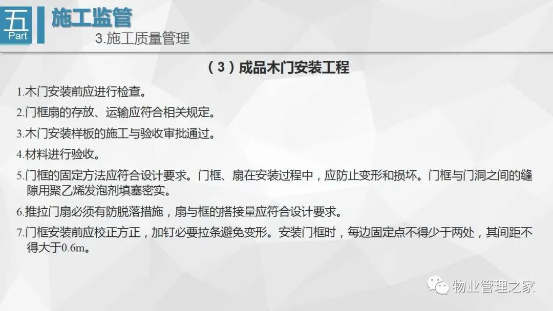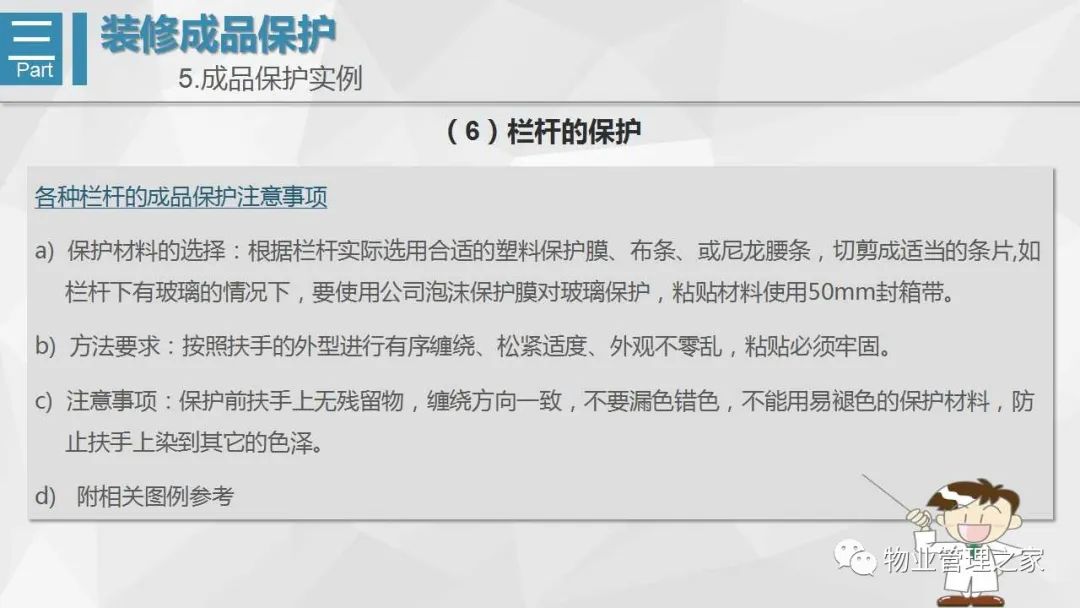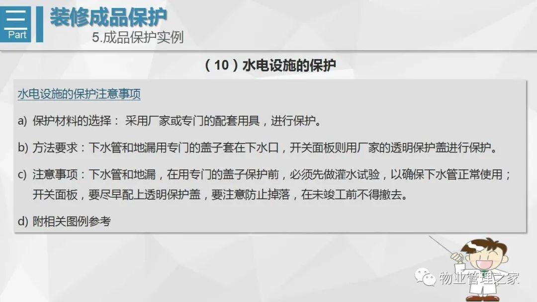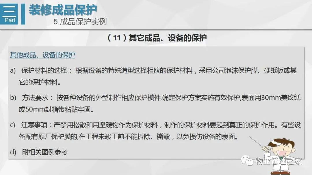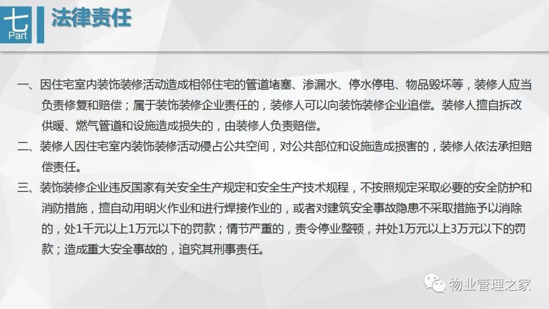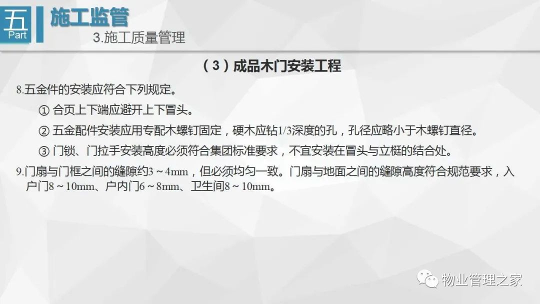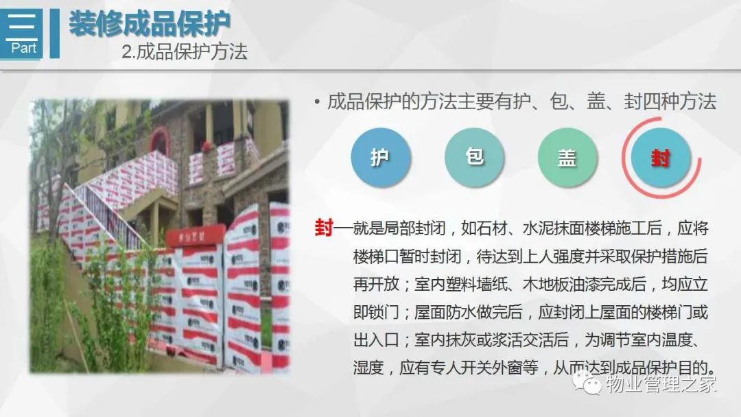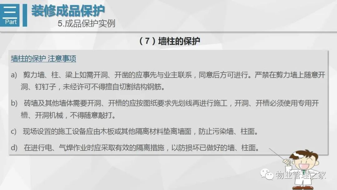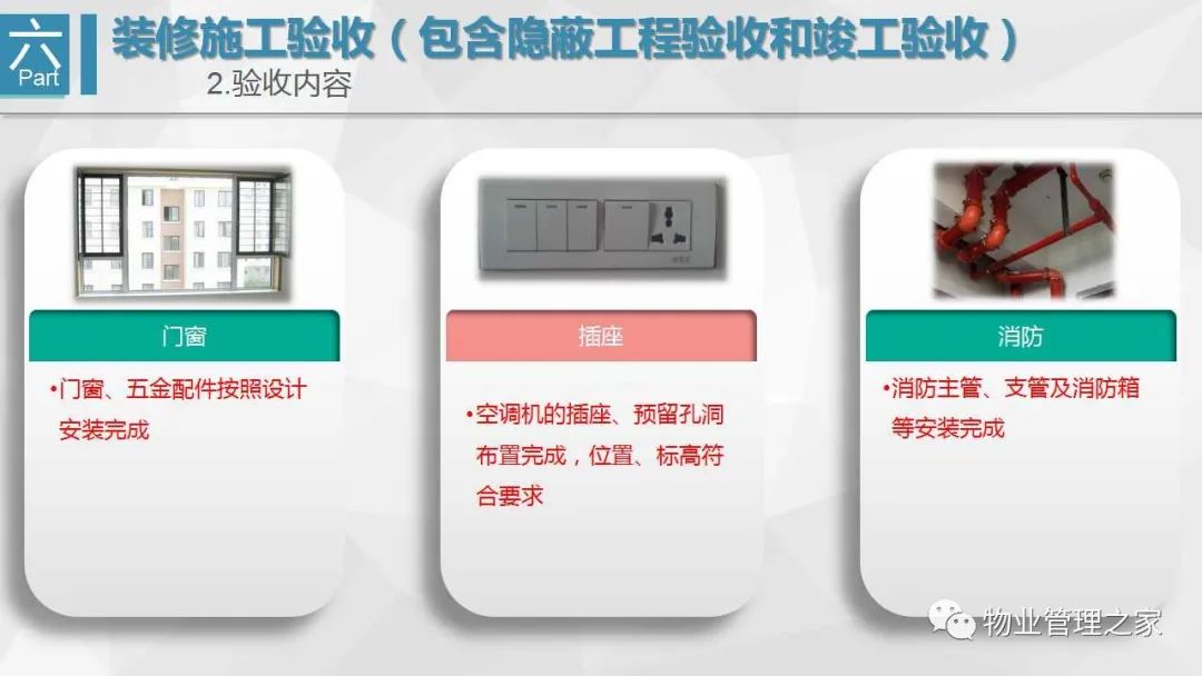 PPT共107页因微信文章篇幅所限内容无法通过微信文章分享给大家免费下载方法:关注《物业管理之家》微信公众号公众号对话框回复:装修课件即可收到下载资料1、免费下载 | 物业保洁作业规范和品控、基本知识培训2、免费下载 | 物业经理必备—管理手册3、免费下载 | 物业公司创优材料申报4、免费下载 | 《 民法典 》高空抛物PPT课件大全5、免费下载 | 实用干货!物业工程师手册6、免费下载 | 高层建筑消防安全隐患PPT培训课件7、免费下载 | 物业服务标书大全—96个标书8、免费下载 | 物业公司之精益管理【含各部门工作流程、应急预案】9、免费下载 | 物业服务各类合同大全【32套】10、免费下载 | 物业服务礼仪标准培训PPT11、免费下载 | 【干货PPT】物业管理培训课程12、免费下载 | 商场、超市保洁服务手册、方案、合同、标准13、免费下载 | 办公大楼物业管理服务投标书14、免费下载 | 标杆物业管理培训课件—现场管理15、免费下载 | 物业装修管理培训PPT(含常用表格文件)16、免费下载 | 实用!物业管理制度与岗位职责17、免费下载 | 物业员工服务礼仪及沟通技巧培训课件 18、免费下载 | 万科物业全套作业指导文件19、免费下载 | 商务写字楼物业管理投标文件20、免费下载 | 万科物业职能管理体系文件【45个】21、免费下载 | 物业防汛大全(含各类应急预案、温馨提示、总结、提示语)22、免费下载 | 物业标准管理大全(含住宅小区、高层、写字楼管理、业主公约) 微信 |电话:199 0636 8688 王老师 微信 |电话:188 0636 7288 李老师全国客户服务热线:400 8899 681扫描二维码加我微信点击“阅读原文”百部免费物业资料