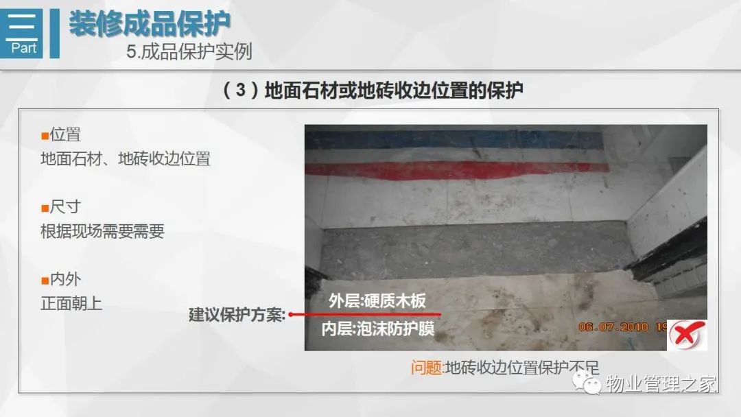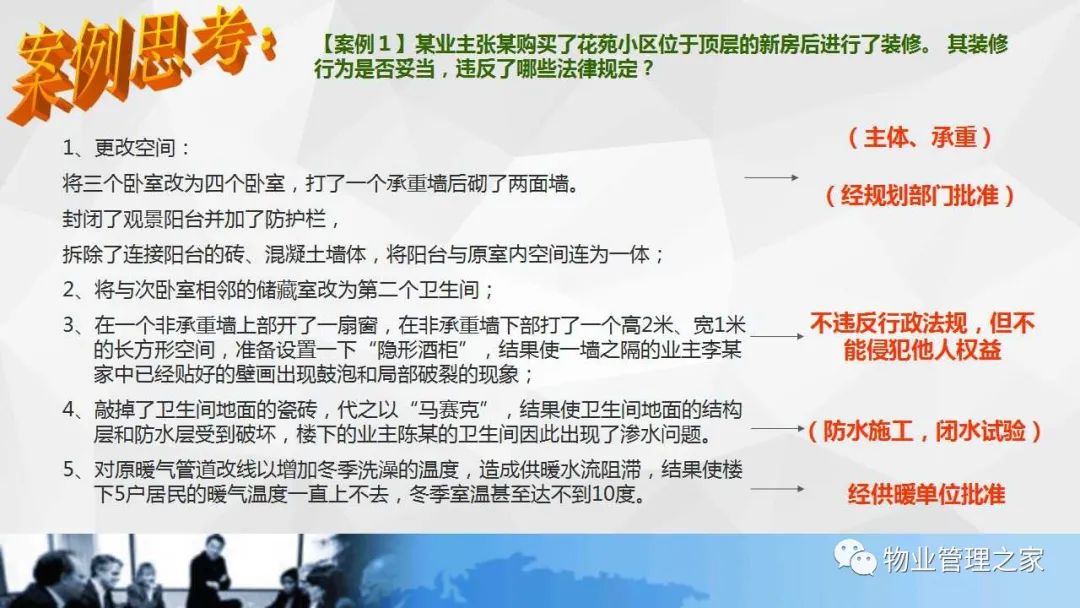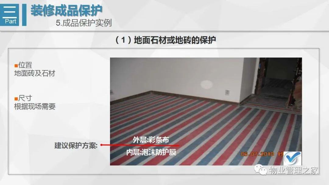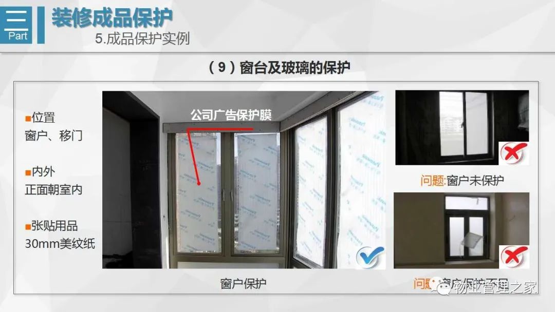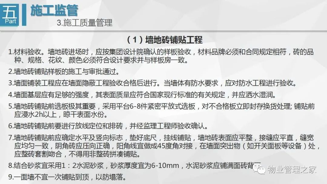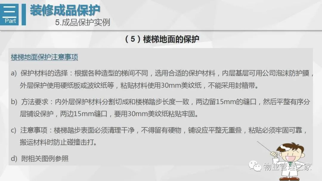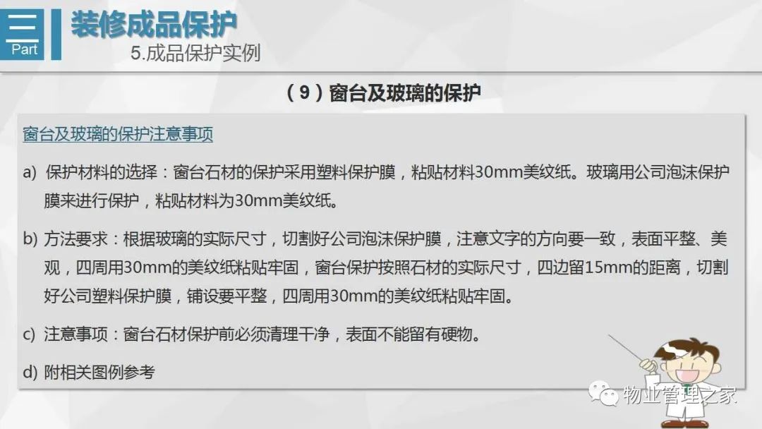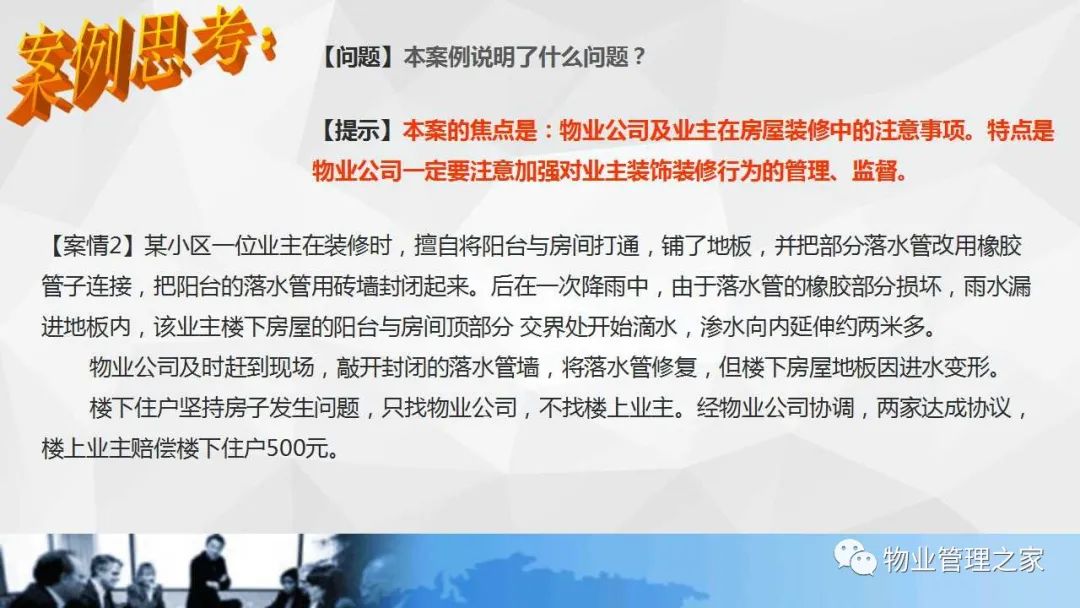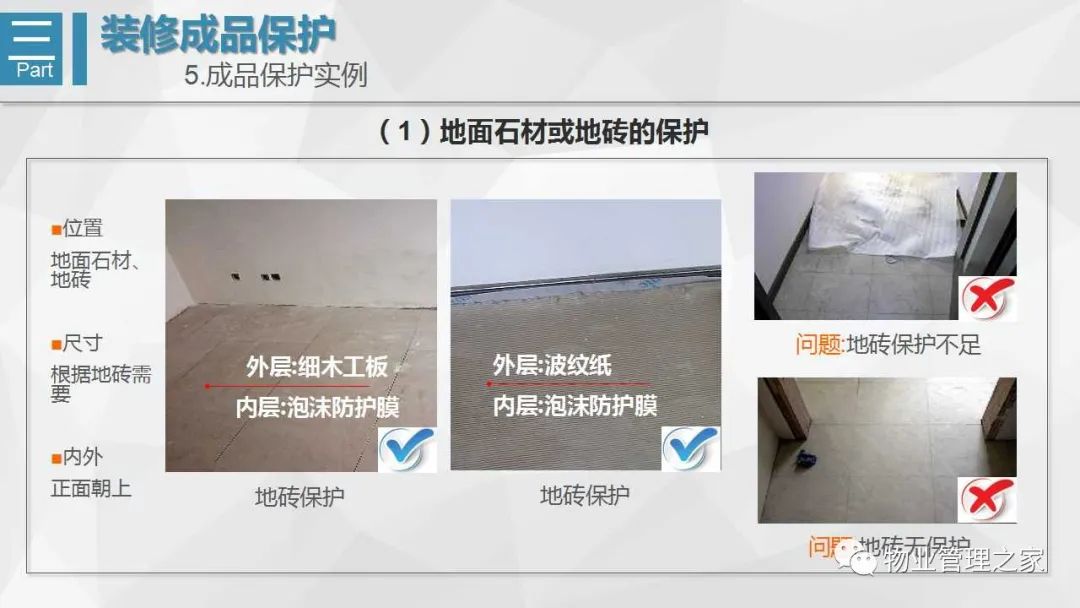 PPT共107页因微信文章篇幅所限内容无法通过微信文章分享给大家免费下载方法:关注《物业管理之家》微信公众号公众号对话框回复:装修课件即可收到下载资料1、免费下载 | 物业保洁作业规范和品控、基本知识培训2、免费下载 | 物业经理必备—管理手册3、免费下载 | 物业公司创优材料申报4、免费下载 | 《 民法典 》高空抛物PPT课件大全5、免费下载 | 实用干货!物业工程师手册6、免费下载 | 高层建筑消防安全隐患PPT培训课件7、免费下载 | 物业服务标书大全—96个标书8、免费下载 | 物业公司之精益管理【含各部门工作流程、应急预案】9、免费下载 | 物业服务各类合同大全【32套】10、免费下载 | 物业服务礼仪标准培训PPT11、免费下载 | 【干货PPT】物业管理培训课程12、免费下载 | 商场、超市保洁服务手册、方案、合同、标准13、免费下载 | 办公大楼物业管理服务投标书14、免费下载 | 标杆物业管理培训课件—现场管理15、免费下载 | 物业装修管理培训PPT(含常用表格文件)16、免费下载 | 实用!物业管理制度与岗位职责17、免费下载 | 物业员工服务礼仪及沟通技巧培训课件 18、免费下载 | 万科物业全套作业指导文件19、免费下载 | 商务写字楼物业管理投标文件20、免费下载 | 万科物业职能管理体系文件【45个】21、免费下载 | 物业防汛大全(含各类应急预案、温馨提示、总结、提示语)22、免费下载 | 物业标准管理大全(含住宅小区、高层、写字楼管理、业主公约) 微信 |电话:199 0636 8688 王老师 微信 |电话:188 0636 7288 李老师全国客户服务热线:400 8899 681扫描二维码加我微信点击“阅读原文”百部免费物业资料